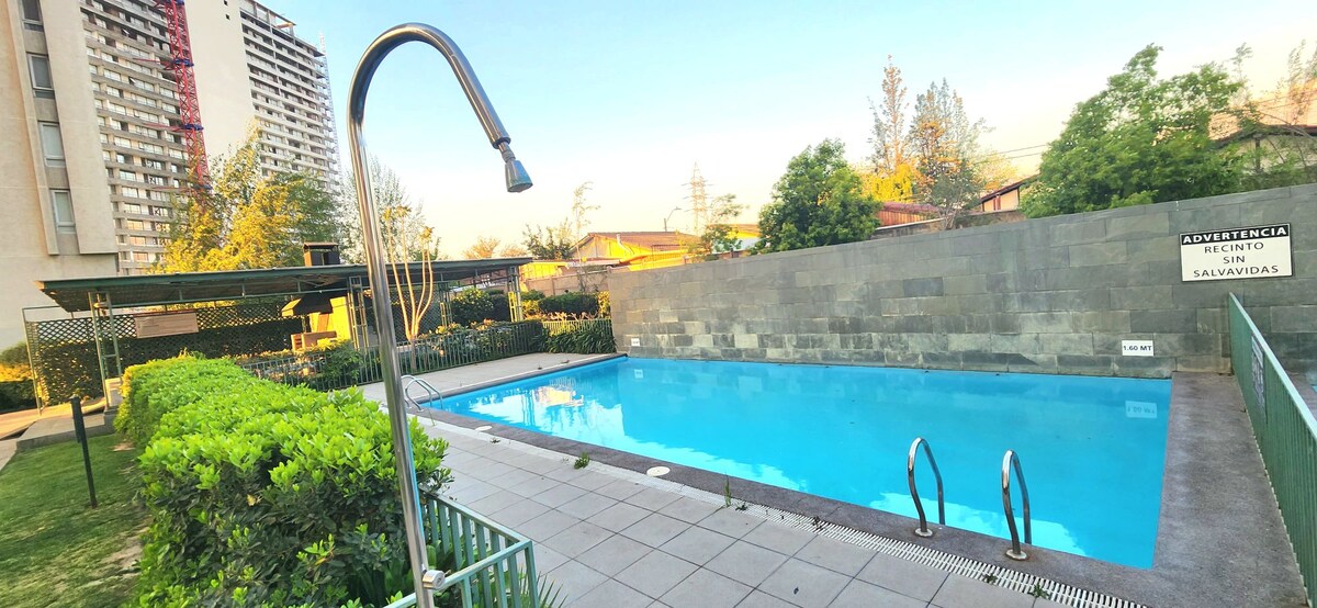 Disfruta, relájate y conoce Santiago Departamento nuevo, full equipado ubicado estratégicamente, ya que además de estar al lado del metro Escuela Agrícola y a pasos de universidades, restaurantes, y sólo a algunos minutos de centros de salud, mall, estadio nacional, etc. Con 1 dormitorio y 1 baño, picina, gimnasio, quincho, lavandería, zona recreativa para niños, áreas verdes, estacionamiento ($4.500 extra por noche) y seguridad 24/7; ideal para familia, parejas, amigos y aventureros.