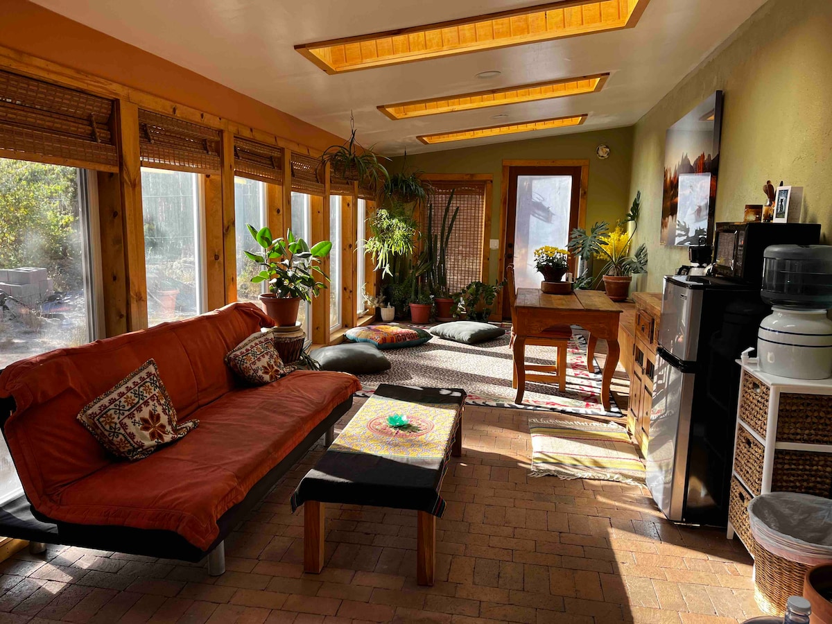 (Tidak ada hewan peliharaan) Pilih keheningan, kesendirian di pondok berperabot BER - AC 12'x14' kami, dengan pemandangan jendela foto Mesa; tempat tidur, meja, kursi goyang, dapur kecil. (1 tamu saja) dan Wi - Fi. Ruang yang didedikasikan untuk meditasi, doa, menulis. Pancuran pribadi 90 langkah lagi, di dalam rumah utama. Jalur lintas alam berjarak beberapa menit. Vaksinasi direkomendasikan. (Catatan: ruang peristirahatan kedua kami, di dalam rumah utama, memiliki kamar mandi pribadi, penggunaan dapur, perpustakaan, dan LR.)