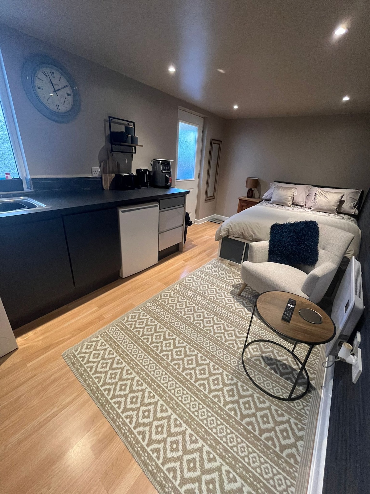 KABIN - dibangun di bagian belakang taman, cocok untuk satu orang dalam jangka panjang atau pasangan untuk menghabiskan waktu di tempat yang nyaman. Ruang mandiri sepenuhnya di dua lantai termasuk; - Dapur dengan oven, kompor, microwave, kulkas, freezer dan wastafel. - Shower berjalan, toilet, dan wastafel. - Ruang Tamu dengan sofa dan TV - Kamar tidur dengan tempat tidur double dan ruang lemari pakaian. Parkir jalan gratis. Tersedia mesin cuci dan pengering (dikenakan biaya) Sewa sudah termasuk semua tagihan termasuk WiFi.