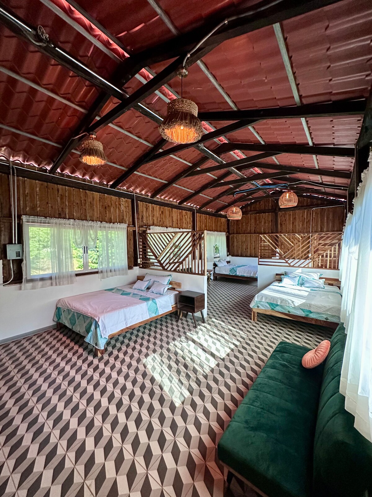 Ruang yang luas dan nyaman ideal untuk keluarga atau rombongan yang terdiri dari 4 hingga 5 orang. Tempat ini memiliki dua tempat tidur double, sofa bed, kamar mandi pribadi, dan lingkungan yang sejuk dikelilingi oleh alam. Cocok untuk beristirahat setelah berkeliling Ruta de las Flores dan menikmati ketenangan Juayua.