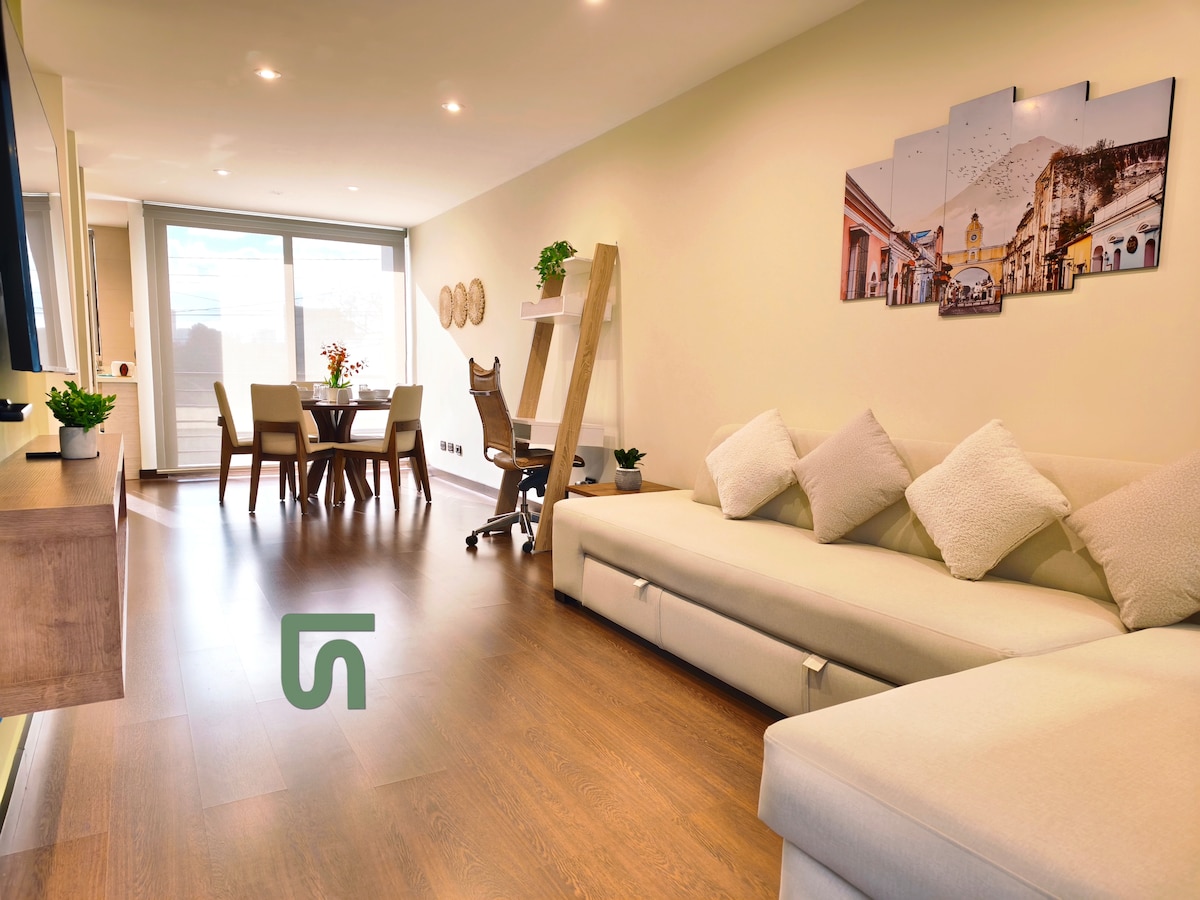 Terletak di salah satu area teraman, semarak, aktif, paling mudah berjalan kaki & nyaman di Guatemala City dengan semua kenyamanan apartemen yang luas dan cerah ini. Tempat yang nyaman, dirancang dengan cermat, dan dengan segala kebutuhan Anda untuk menginap dengan sempurna. Kapasitas untuk 5 tamu, dengan dua kamar tidur dengan kamar mandi pribadi masing - masing dan satu tempat tidur sofa, kamar utama besar, balkon pribadi, dapur lengkap, satu parkir dan akses ke fasilitas bangunan yang indah: ruang kerja kantor, teras dengan kolam renang, pusat kebugaran, taman.
