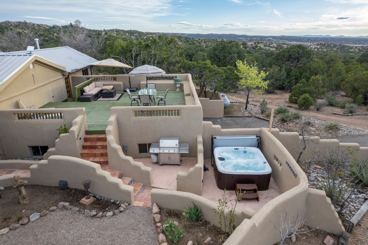 ★ "Ini benar - benar pelarian pegunungan, dan pemandangannya luar biasa.." ☞ Luxe Secluded 3,75 acre property ☞ Patio dengan BBQ + bak mandi air panas + pemandangan gunung ☞ Halaman dengan perapian + tempat duduk ☞ Perapian Kiva dalam ruangan ☞ Proyektor + TV pintar 65”( 2) dengan Netflix Ruang ☞ yoga/meditasi/gym ☞ Pemanas lantai radiasi Ramah ☞ hewan peliharaan * 10 menit → Sante Fe Plaza (kafe, toko, tempat makan) 15 menit → DT Sante Fe + Bandara Regional Santa Fe ✈