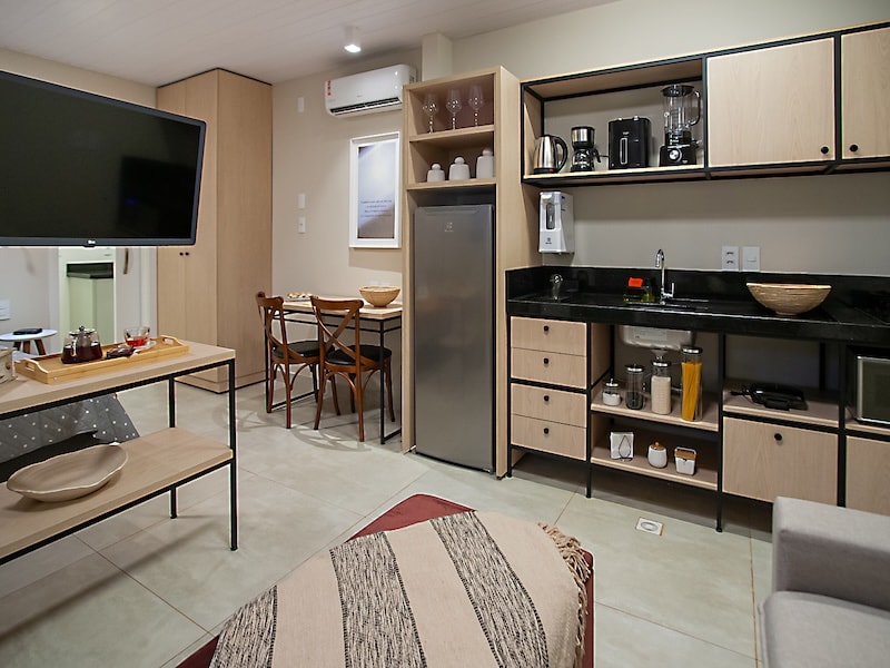 Kamar untuk dua orang dengan: - AC dingin; - TV ramping dengan akses internet; - Kamar mandi dengan pancuran air panas; - Meja dengan dua kursi; - Dapur yang dilengkapi panci dan wajan, peralatan makan, kompor, kain, dll.; - Garasi tertutup dan akses dengan kontrol; - Bar kulkas; - Bangunan dengan hanya satu tahun konstruksi; *Pasar - 650 meter *Apotek - 550 meter *Bakery - 500 Meter *Belanja - 1,7 km.