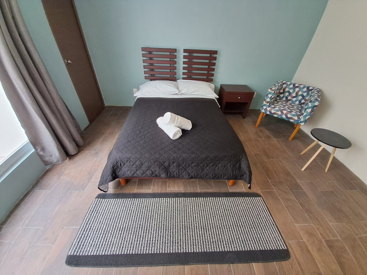 loteng lucu dengan tempat tidur berukuran king yang nyaman, kamar mandi yang luas, dapur dan lokasi yang sangat baik. Restoran, bar, tempat wisata, apotek, jalan utama, transportasi, dan berbagai bisnis berjarak beberapa langkah. Air panas 24 jam Sangat cocok untuk mengenal berjalan kaki di Cholula. Parkirnya di jalan, di luar, jendela di samping tempat tidur, Anda bisa melihat mobilnya, (area aman,tetangga meninggalkan kendaraan di sana, karena sona centro).