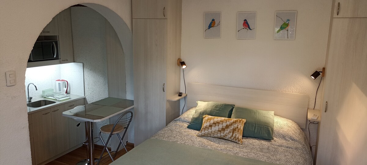 Es un mini departamento de 15 m2 benar - benar independen dari pintu masuk ke ruang pribadi. dengan piring mesin cuci piring kulkas microwave, layanan ketel listrik 1 meja makan kecil dengan 2 kursi Smart tv e internet kamar mandi pribadi dengan pancuran air panas en - suite (di dalam apartemen) selain lemari tempat tidur 2 tempat duduk tutup semuanya agar masa menginap Anda sangat menyenangkan dan tenang
