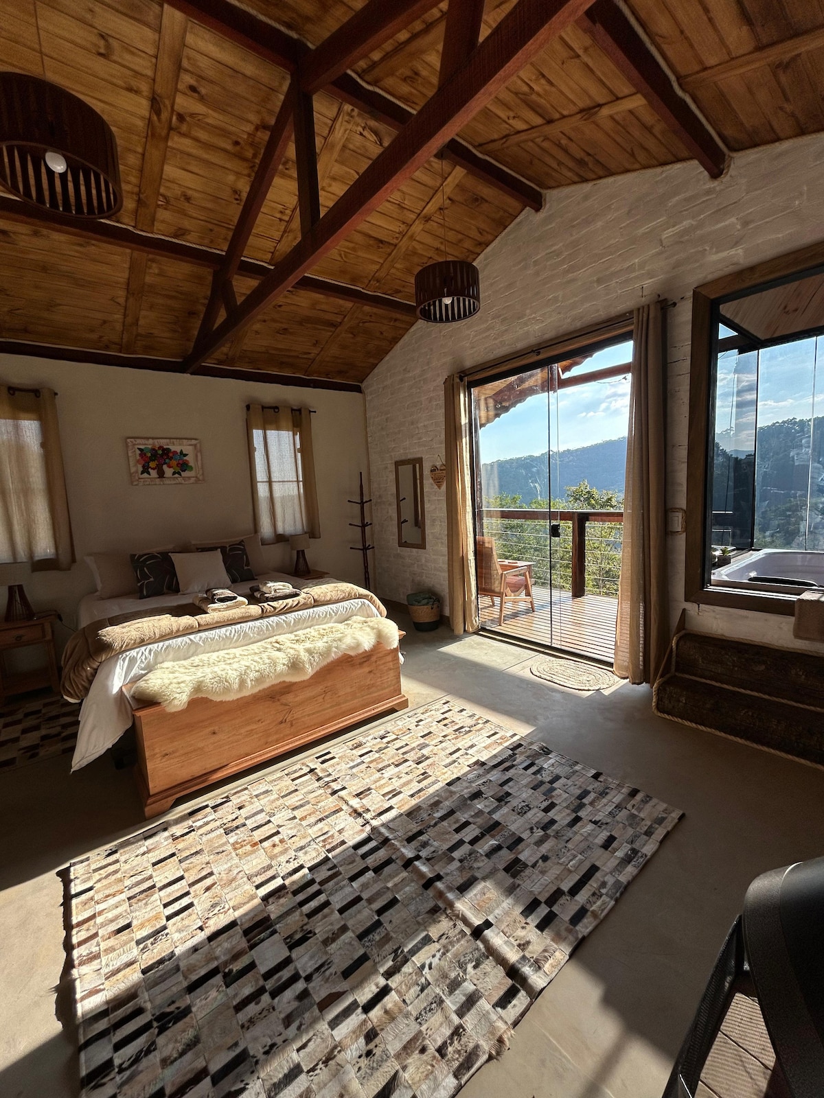 Saat Anda memasuki chalet, Anda menemukan lingkungan yang mengacu pada cahaya dan harmoni, sangat cocok untuk beristirahat dan memulihkan energi. Terinspirasi oleh esensi lembut vanila, bagian dalam pondok menggabungkan nada netral dan bahan alami yang menyampaikan rasa tenang dan sejahtera. Jendela besar memungkinkan cahaya alami mengalir dan pemandangan Serra da Mantiqueira yang riang untuk mengisi ruangan. Tempat ideal bagi mereka yang mencari momen damai dan pengalaman yang ramah di tengah alam.
