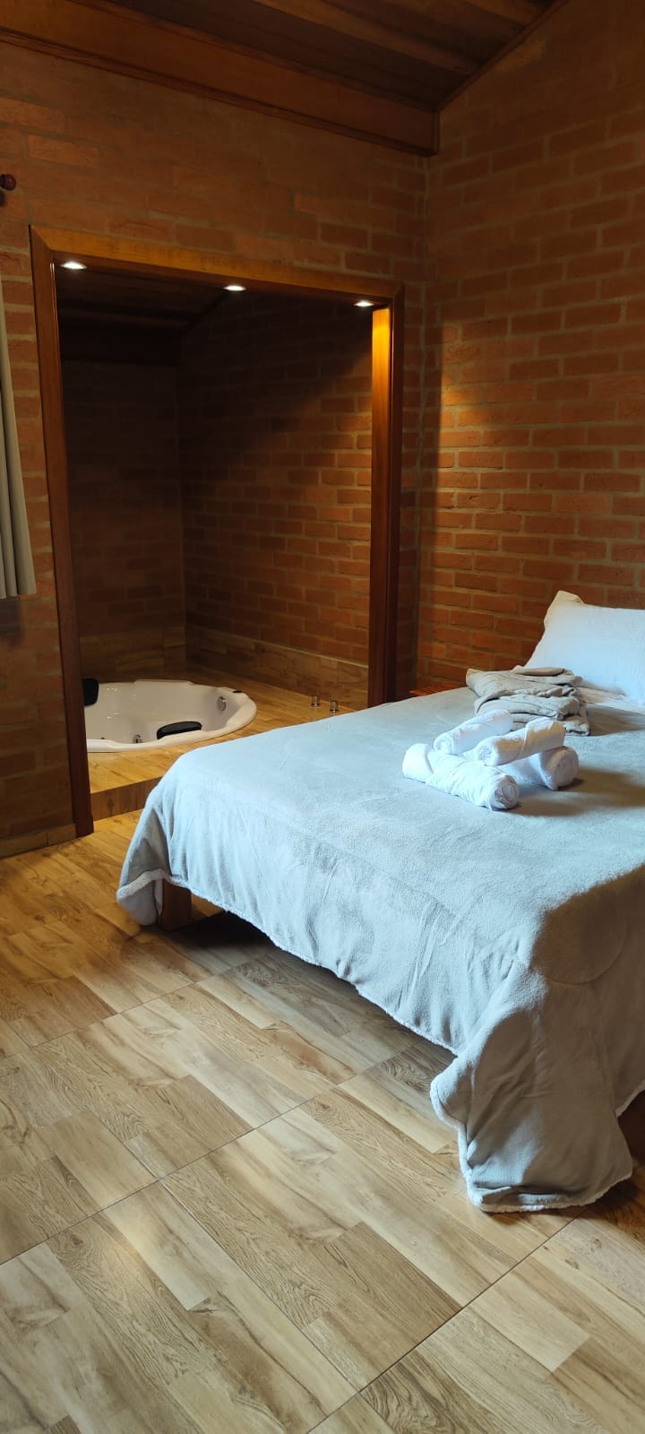 Chalé nyaman, ideal untuk pasangan. Tempat ini memiliki bak mandi air panas untuk pasangan dengan pemandangan sensasional dan perapian internal. Air bertekanan dan pemanas gas pada semua keran dan shower. Internet 150mb dan SmartTV 50". Mesin Kopi dalam kapsul 3 Corações Tempat tidur dan kasur berukuran queen berkualitas tinggi. Kompor, minibar, microwave, dan peralatan dapur. Parkir di depan chalet. Termasuk jubah mandi, seprai, dan jubah mandi