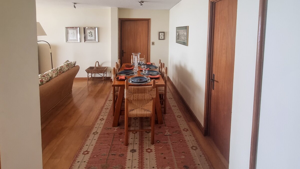 Apartemen yang indah, siap untuk istirahat spektakuler bersama keluarga Anda. Apartemen ini memiliki dua tempat parkir pribadi, 3 kamar tidur (dengan seprai dan handuk), pemanggang barbekyu, teras besar, taman indah, kolam renang, lapangan tenis , quinchos, dan pemandangan spektakuler ke arah lapangan golf Santo Domingo. Nikmati liburan Anda di apartemen kami. Sama - sama.