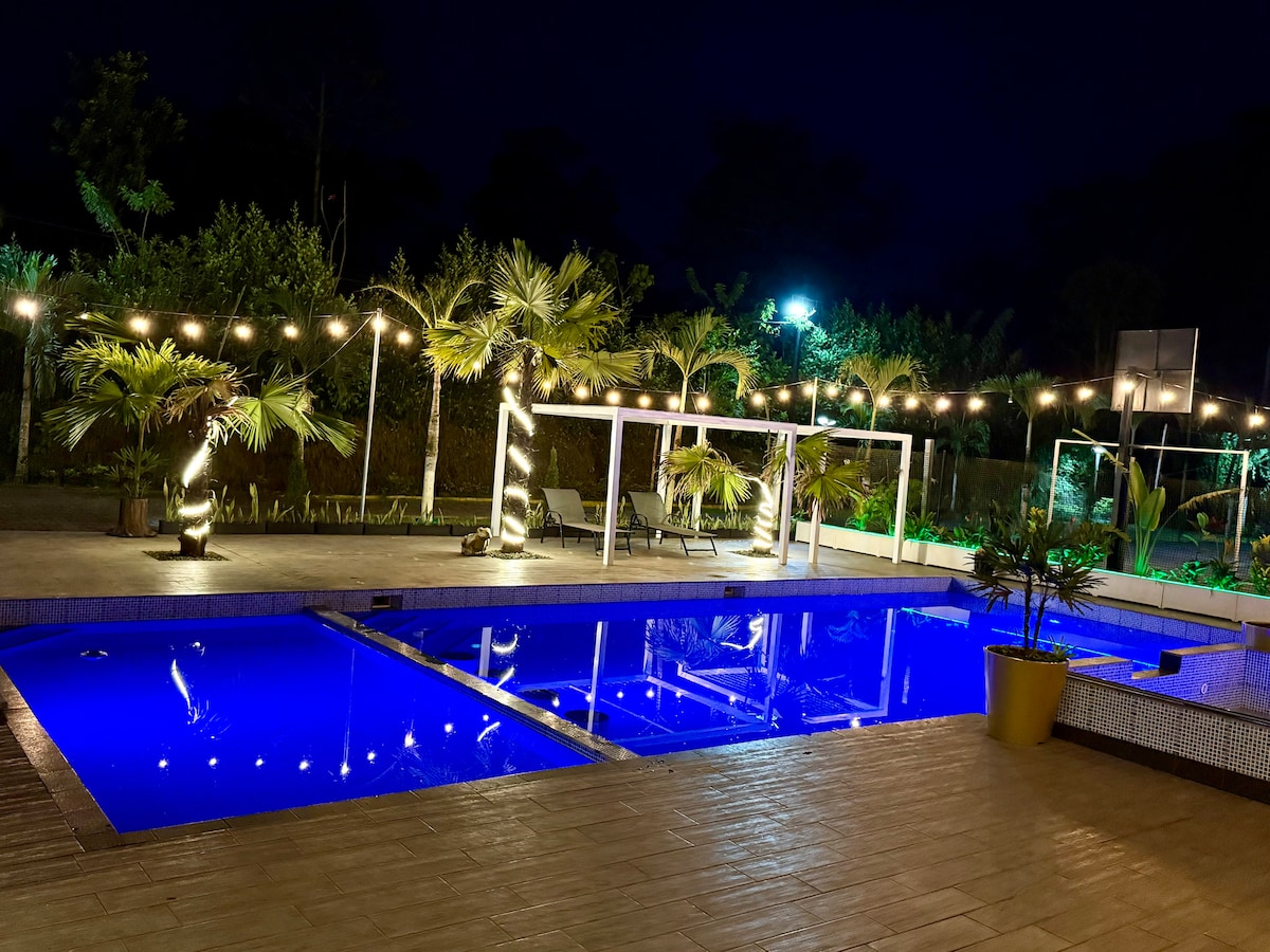 Relájate con tu familia y amigos en este tranquilo y acogedor lugar para quedarse, rodeado de naturaleza… con una hermosa piscina infinita, cancha de fútbol, área de hamacas, área de fogata, área bbq y demás espacios verdes que te cautivarán.