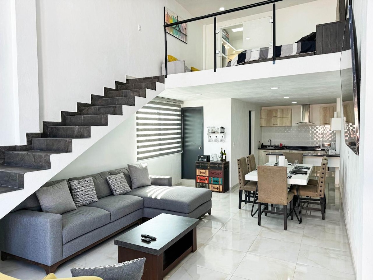 Cozy loft in a private gated community, perfect for relaxing after a long day. Upstairs you'll find a double bed, large closet, garden-view windows, and a private terrace. Downstairs features a fully equipped kitchen, full bathroom, washer/dryer, a sofa bed, and a lounge chair. Ideal for short or extended stays. If you want to experience true Mexican hospitality, this is the perfect place.