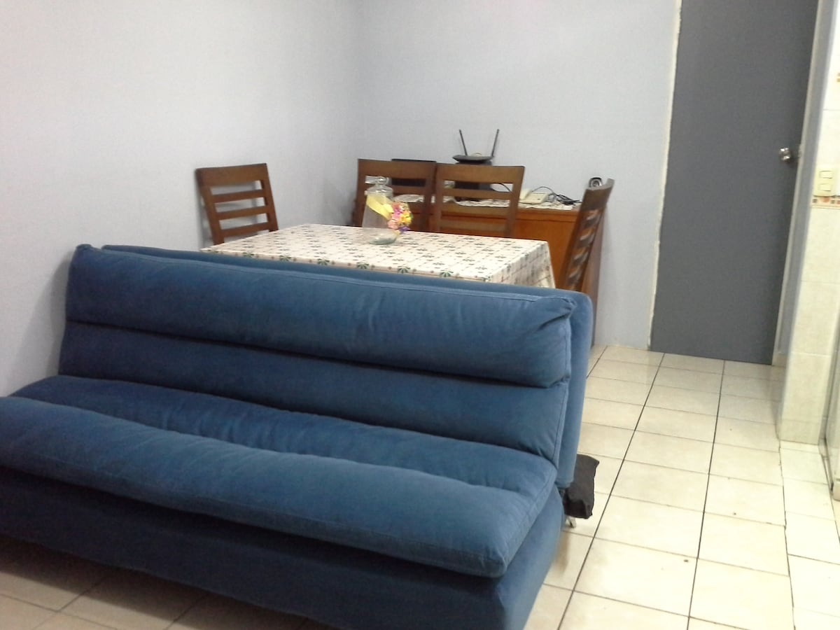 Apartemen yang bagus dengan 1 kamar tidur, kamar mandi, dapur lengkap, mesin cuci dan kamar yang indah dengan balkon, dengan PARKIR PLATFORM BERSAMA, untuk 1 KENDARAAN UKURAN KONVENSIONAL = Maksimum Sedang. Tidak ada penjemputan (Anda meninggalkan kunci mobil). Nikmati tempat yang unik dan tenang selama kunjungan Anda ke kota, sangat dekat dengan Taman Bicentenario, Plan Sexenal, IPADE, Unitec Cuitláhuac dan Arena CDMX. 5 menit ke metro Cuitláhuac, 15 menit ke Polanco dan 20 menit ke Centro Histórico.