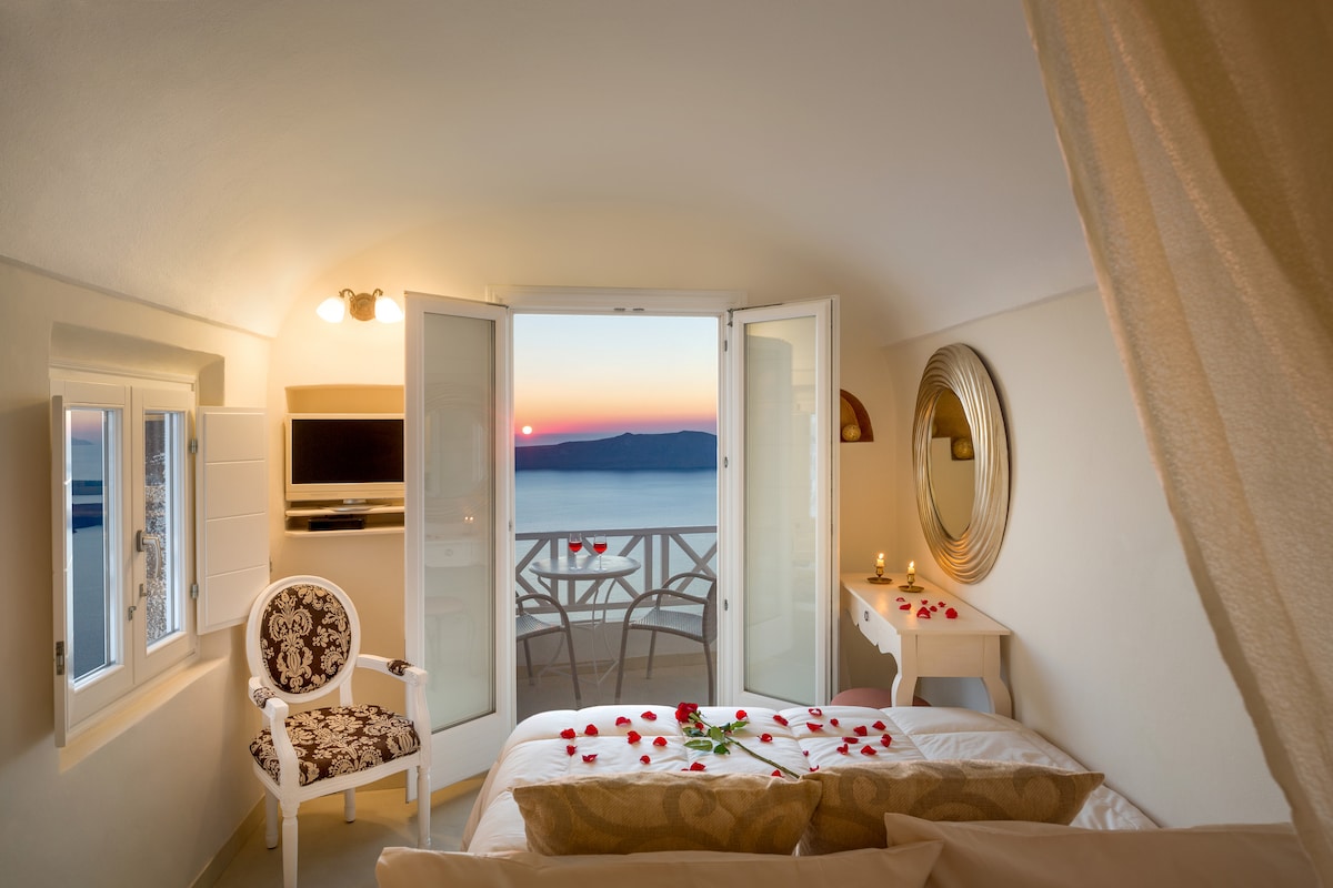 Suite elegan ini terletak di tebing kaldera di Oia. Tempat ini menggabungkan arsitektur Kyklades tradisional dengan gaya dekoratif minimalis, menjadikannya pilihan sempurna bagi mereka yang ingin bersantai. Suite ini berukuran sekitar 37 m2, dilengkapi bak mandi air panas gua luar ruangan pribadi, menawarkan privasi serta pemandangan kaldera dan gunung berapi yang menakjubkan. Sarapan sudah termasuk dalam harga. Kamar dilengkapi dengan AC, Wi - Fi gratis, fasilitas pembuatan kopi dan teh, fasilitas mandi, dan smart TV.