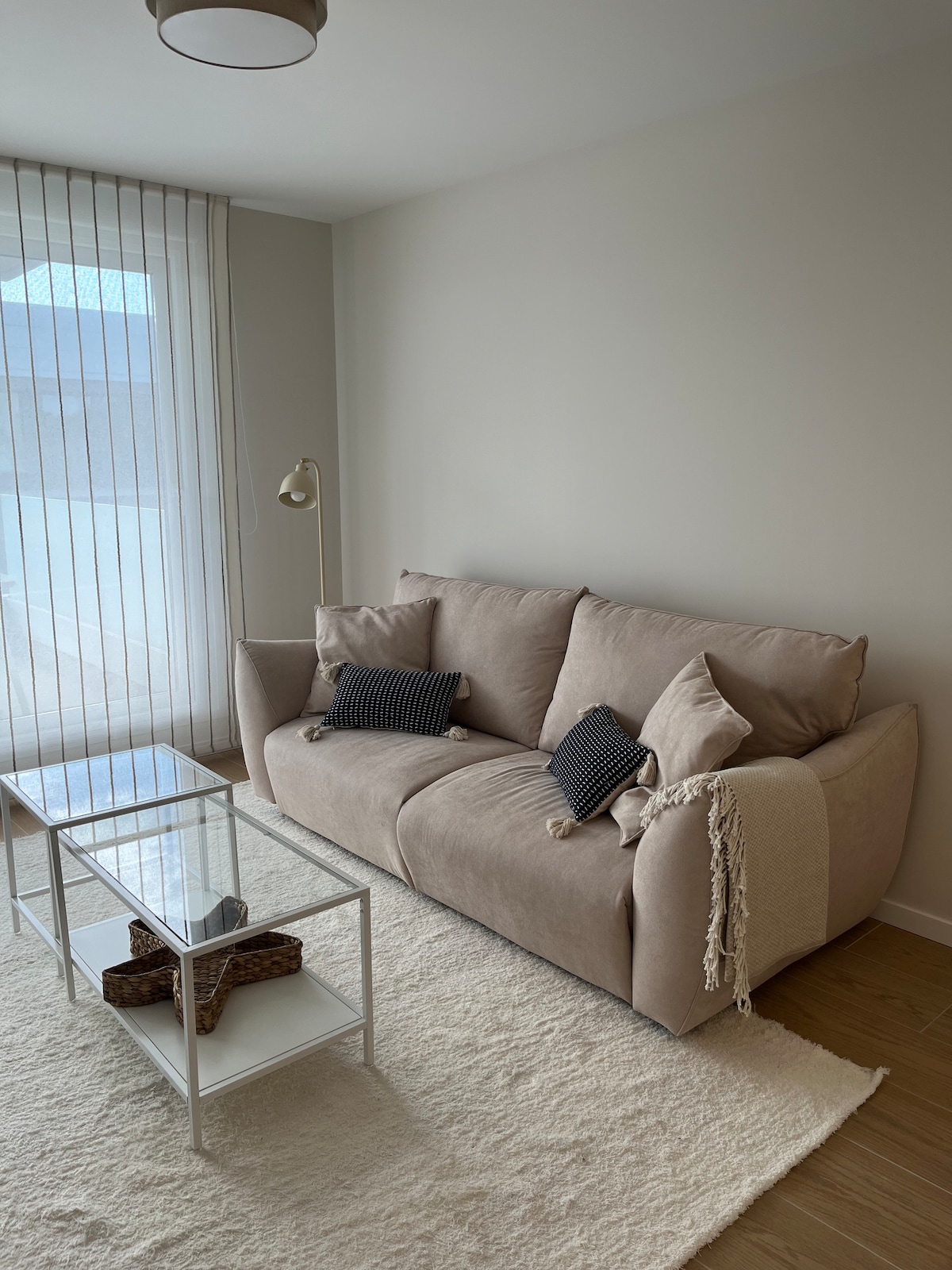 Apartamento a estrenar a 180 metros de la playa Silgar en Sanxenxo. Cocina americana, salón con sofá cama de gama alta de 1,60 (Marmota Premium), Smart TV, dormitorio principal con cama de 1,50 (Marmota Hybrid Premium), vestidor, cuarto de baño, lavandería y una gran terraza con comedor. Incluye: toallas, sábanas, menaje de cocina, tabla de planchar, plancha, tostador, exprimidor, cafetera y todo lo necesario para el alojamiento de un bebé. Piscina, parking, ascensor, wifi y suelo radiante.