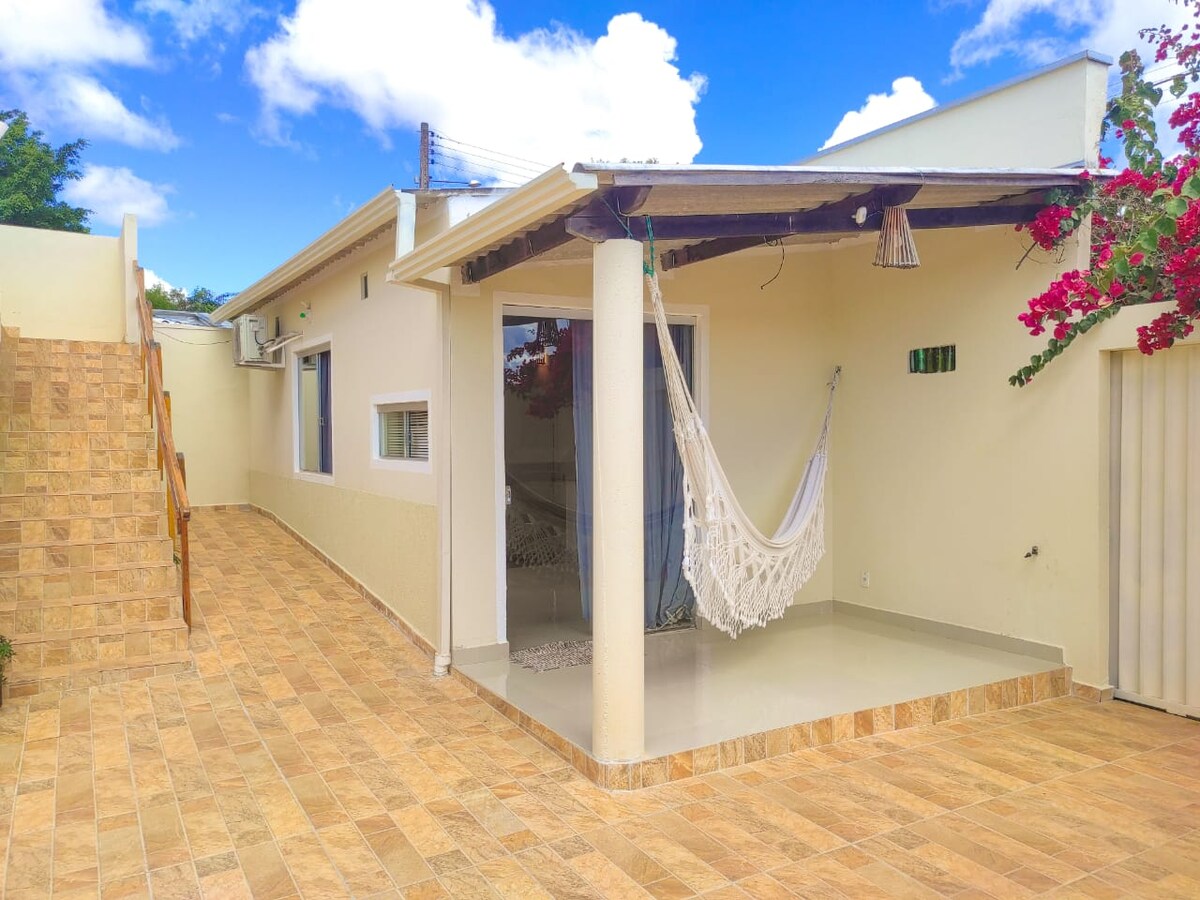 Chalé nyaman dan siap menyambut tamu, sempurna untuk menjadi basis Anda untuk bersantai dan menikmati Chapada dos Veadeiros Vantagens: Ber - ber - AC Wi-Fi 600MB Smart TV Dapur lengkap Balkon dengan jaring. - Private - Garasi 1 tempat tidur double dan 1 tempat tidur single dengan ranjang tambahan 4 orang tidur Keranjang sarapan opsional seharga R$100 per hari untuk 2 orang (dengan perjanjian) Terletak sekitar 900 meter dari pusat Alto Paraíso, di lingkungan yang aman dan tenang