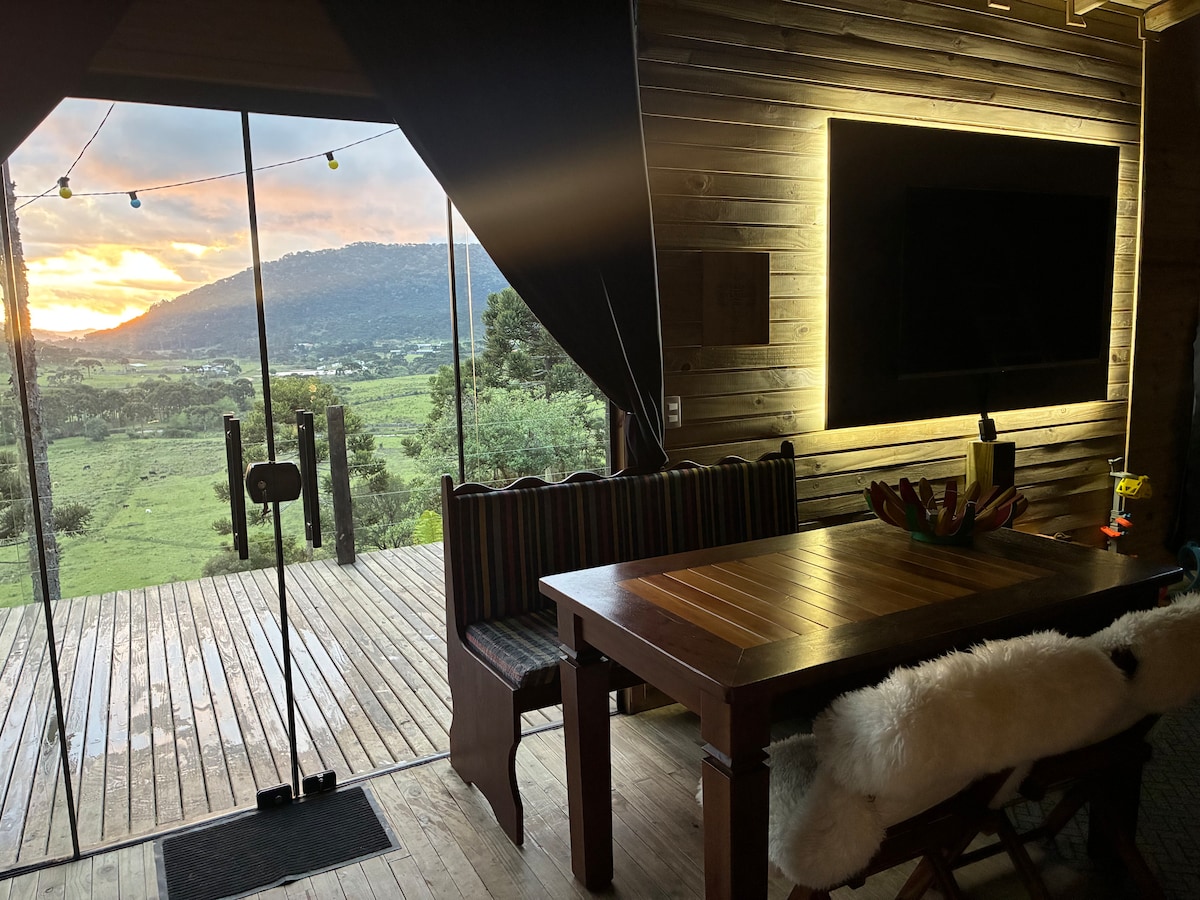 Kabin ini memiliki 1 kamar tidur double dengan 32 smart tv, 1 mezzanine dengan kasur double di lantai, dapur lengkap dan 32 ruang yang terhubung dengan tv, oven listrik microwave, 4 kulkas cooktop mulut, lignoven, sofa, meja dengan 4 kursi, 1 kamar mandi, wi - fi netflix. Dek luar ruangan dengan meja 4 kursi ayunan tak terbatas, perapian luar ruangan, barbekyu di tepi sungai, Cabana Pequeno Bosque adalah tempat yang inovatif dan nyaman dengan pemandangan yang luar biasa adalah lembah dengan keindahan alam.