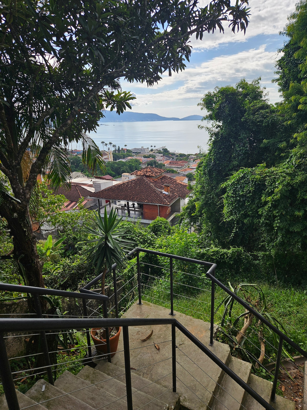 Tempat ini unik dengan banyak gaya dan pemandangan indah jembatan Hercílio luz dan tepi daratan. Di depan terdapat taman berumput, lapangan voli, taman skate, skuter dan bar kecil. 5 menit dari pusat kota Florianópolis. AC DINGIN DI SEMUA KAMAR. Dek besar area gourmet satu kamar tidur, untuk pasangan double bed di luar 2 orang+sofa bed untuk 2 orang. 1 minicasa round with bathroom + kitchenette +1 Single Double+1 Bedroom. 1 qto round independent for couple. 4 ruang parkir