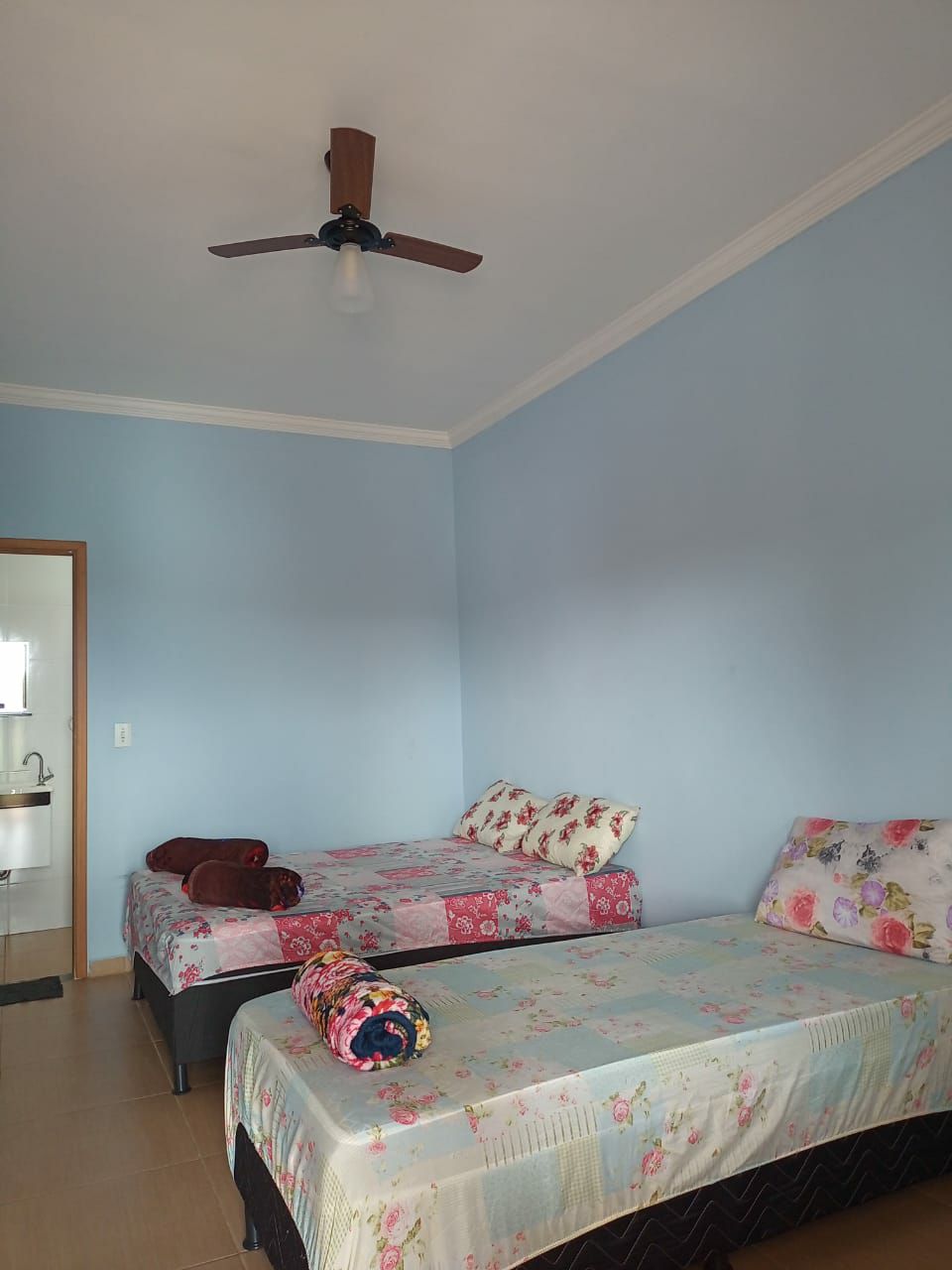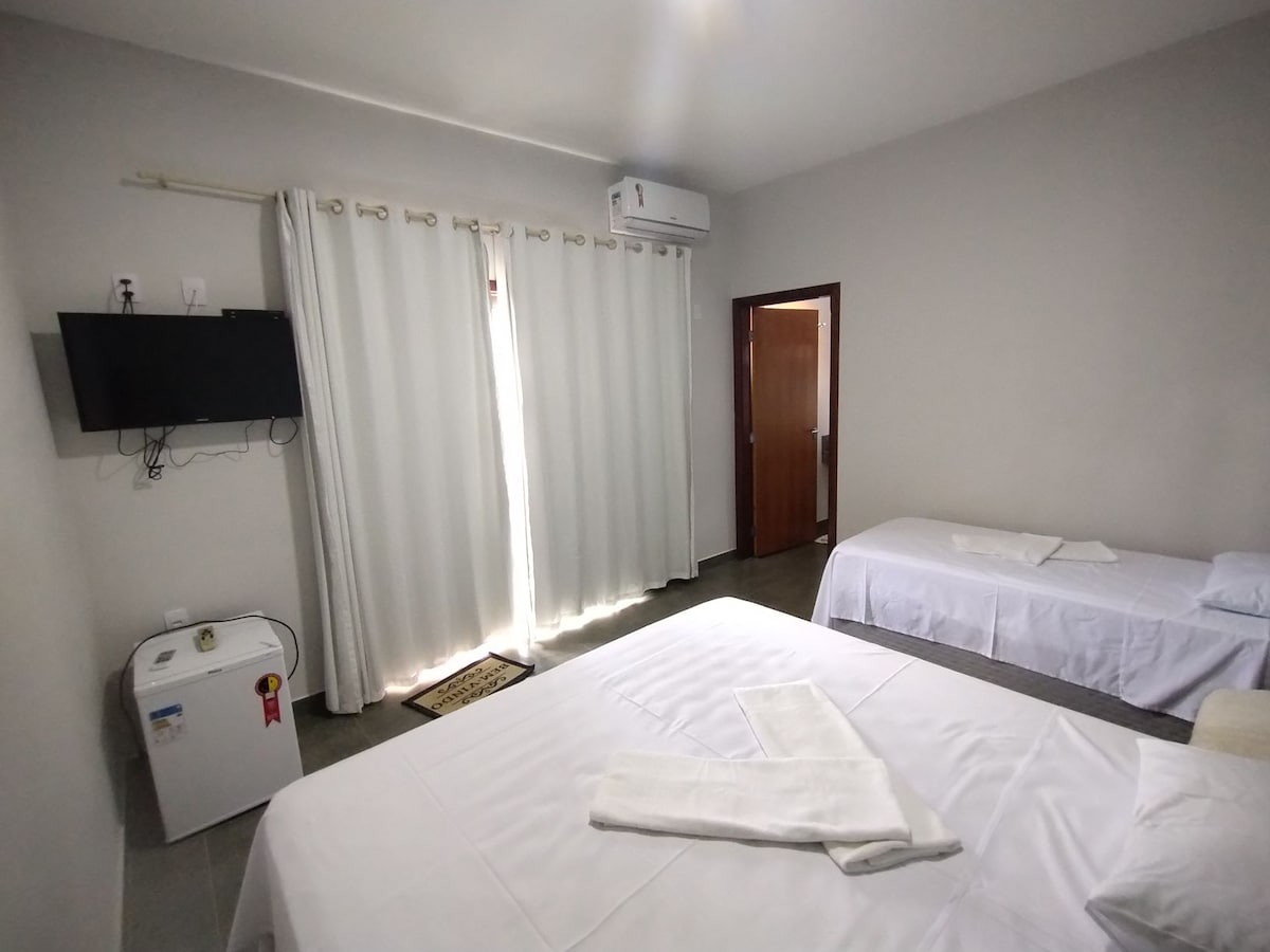 Acomode-se confortavelmente na suíte equipada com uma cama de casal e duas camas de solteiro. Desfrute do ventilador para seu conforto e do banheiro privativo completo com kit de higiene. A suíte oferece roupa de cama macia e toalhas de banho, além de um frigobar para suas bebidas favoritas e um guarda-roupa para organizar seus pertences.