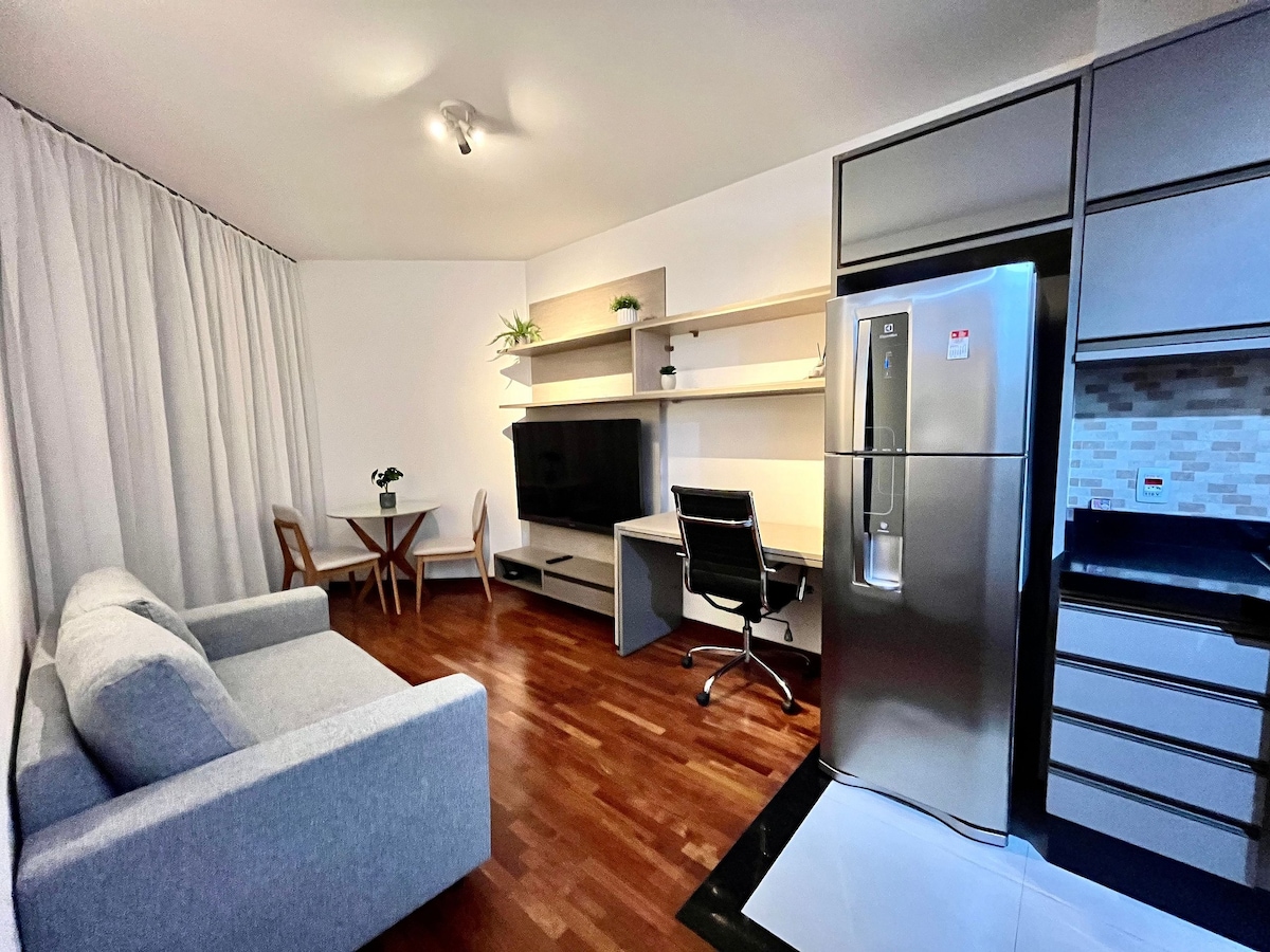 Tempat ini dirancang dalam setiap detail untuk menjadikan masa menginap Anda istimewa. Apartemen lengkap, kamar mandi luas, tempat tidur queen yang nyaman dan tempat tidur sofa untuk 2 orang. Kondominium ini memiliki resepsionis bilingual 24 jam, kolam renang dengan air terjun, sauna , gym dan restoran, dengan sarapan kolonial, makan siang, dan happy hour (layanan opsional dibayar di lokasi). Dekat: Praça Ulisses Guimarães, supermarket, gym, pusat perbelanjaan dan jalan raya Dutra dan Carvalho Pinto.