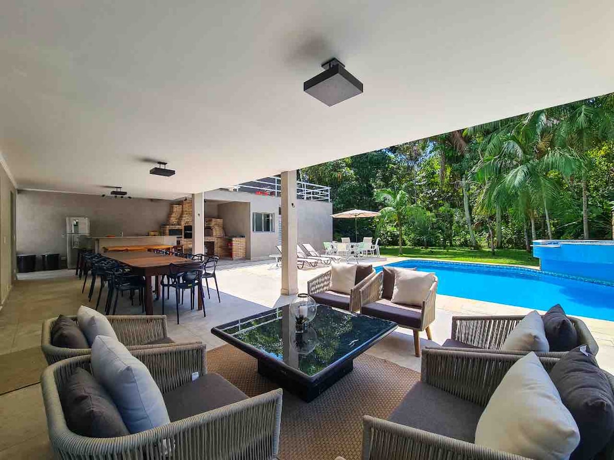 Casa dua lantai dengan infrastruktur lengkap, hanya 2 menit berjalan kaki ke pantai. 4 suite dengan AC (satu di lantai dasar), Wi-Fi 500mg, Smartv,. Area luar ruangan yang mempertimbangkan kolam renang, Jacuzzi, barbekyu, oven pizza, oven kayu dan meja di sekitar alam, tempat tidur gantung, perapian di ruang tamu, kayak. Kondominium yang aman dengan pengenalan wajah, patroli 24 jam, pantai yang tenang dan kosong, sungai. Dapur lengkap, 2 kulkas freezer, dispenser freezer, mesin cuci, kamar tidur.