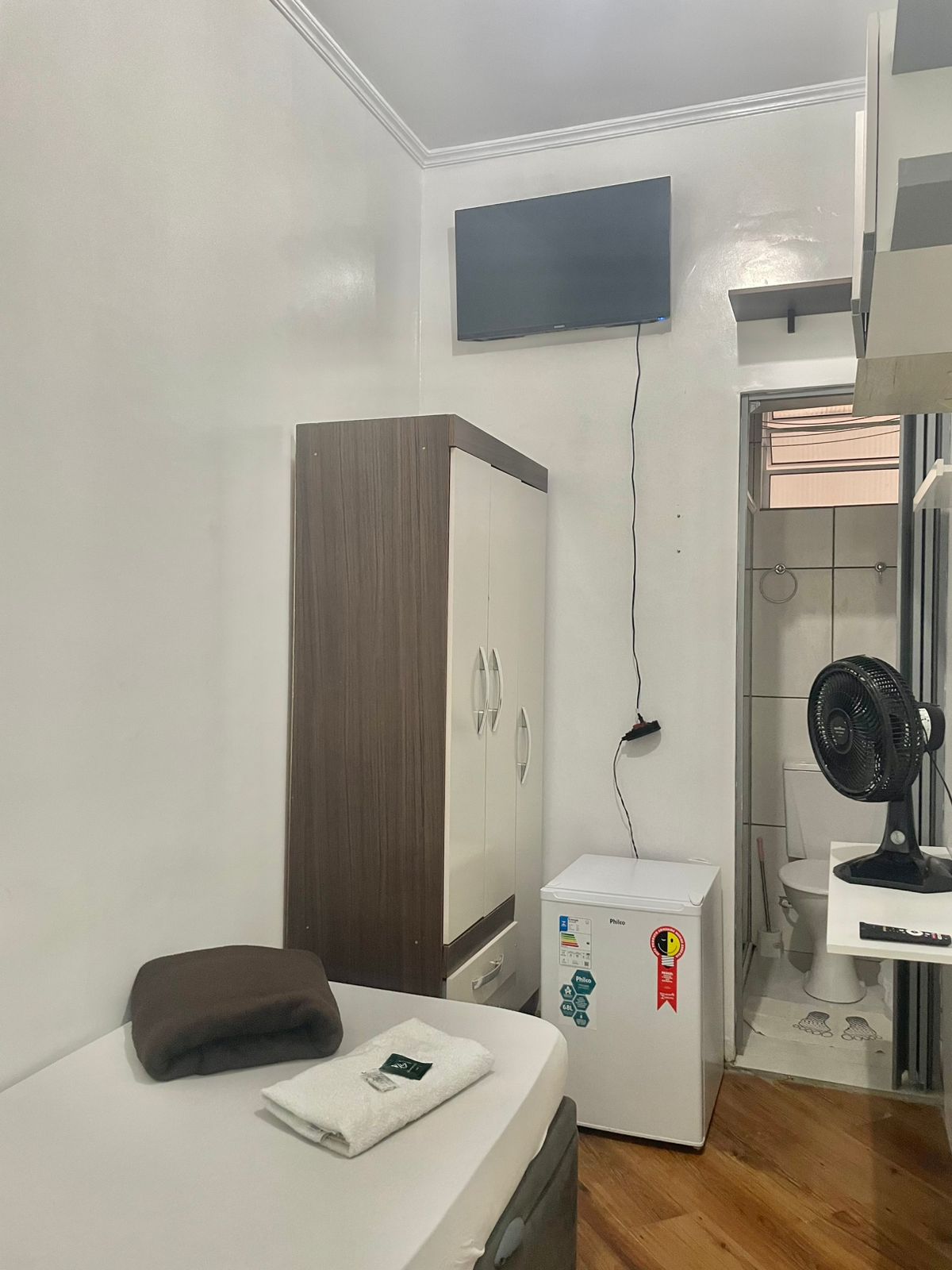 Quarto com banheiro privativo. Quarto individual com banheiro privativo. O quarto com banheiro privativo está equipado com microondas, frigobar, mesa de jantar, pratos, talheres e copos. Inclui TV Smart 43, ferro de passar roupa, secador de cabelo e enxoval de cama e banho.