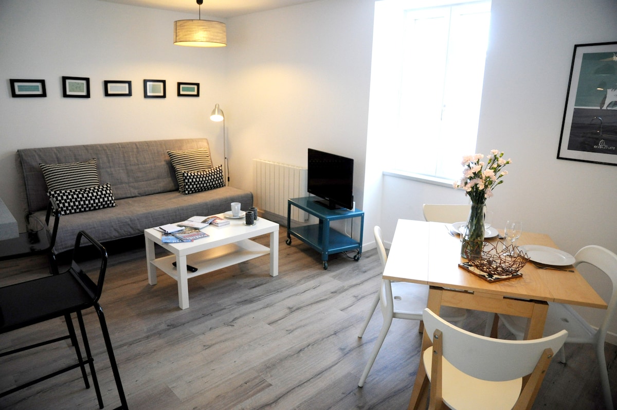 Gaya perkotaan dan nyaman, apartemen satu kamar tidur baru dengan tempat tidur kingsize dan tempat tidur sofa (144x180cm)ini terletak di pusat lingkungan Gros, 1 menit berjalan kaki ke pusat kota Fitur sempurna yang baru direnovasi dengan AC, TV 55", Wifi, Nesspreso. Berfasilitas lengkap untuk anak - anak dan bayi. Terletak sempurna 2 menit dari stasiun bus dan kereta api, serta di samping halte bus langsung ke bandara San Sebastian.