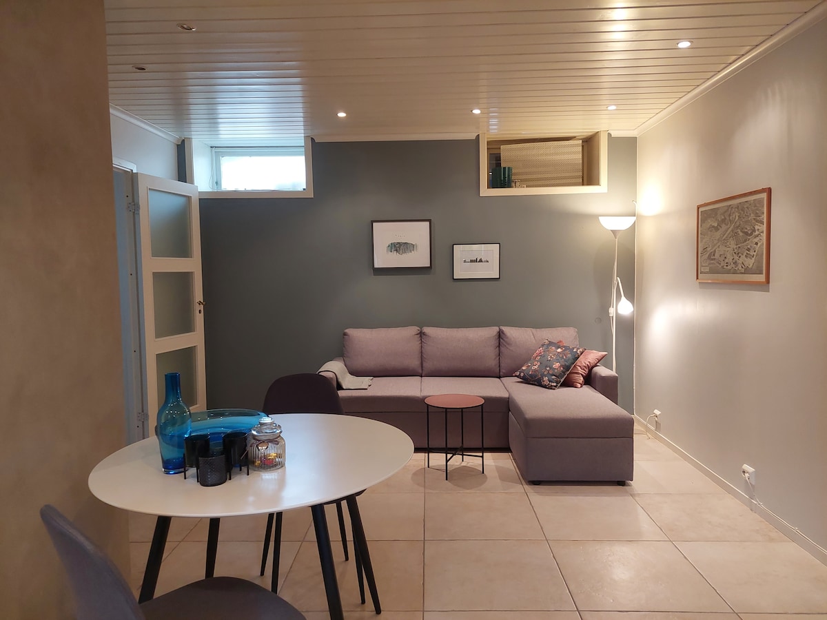 Koselig kjellerleilighet med gratis parkering.