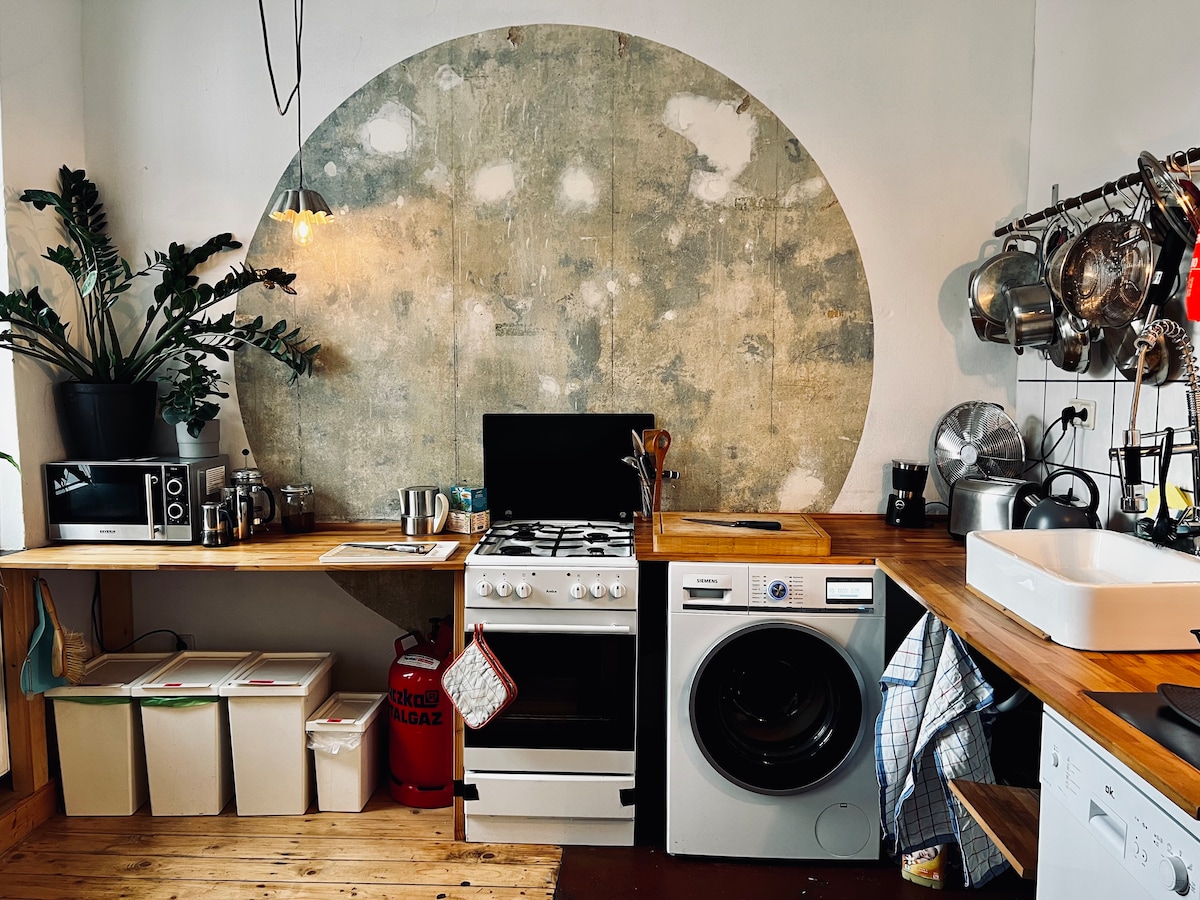 65m2 rares altbauglück renoviert mit viel liebe and authentischer Haptik mit all den essentialen dingen die ein mensch so in einer wohnung braucht aber nicht zu viel das es sie zu voll anfühlt 5 super gemütliche bett Optionen mit frischen baumwoll bettzeug und kleinen handtüchern auf qualitäts matratzen die lokation ist in der mitte des charmantesten und vibrierendsten kitz in leipzig plagwitz *mitten auf der karl heine straße die wohnung befindet sich im 4ten stock *ohne fahrstuhl