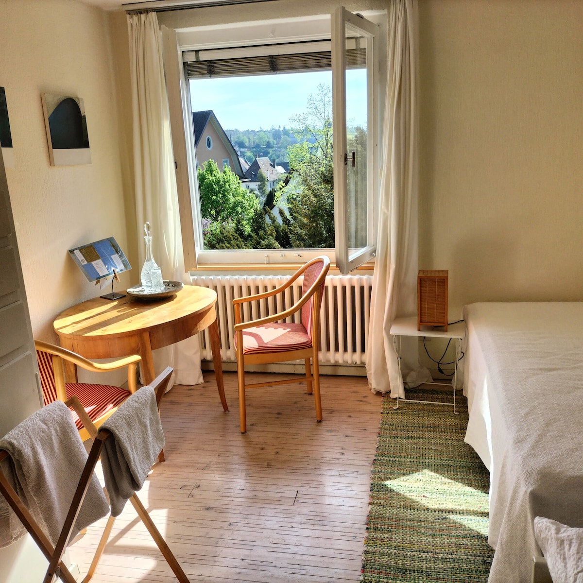 Rumah kami yang berlokasi tenang dan direnovasi dengan indah dari abad ke -19 dengan pesona khusus menawarkan 2 kamar cerah dengan pemandangan di lantai atas. tentang kota tua. Di lantai tamu kami bisa menyiapkan teh. Kami dengan senang hati akan menyiapkan sarapan organik yang enak untuk Anda. CHF 15 per orang dan akan dibayarkan secara tunai di situs. Welan berakhir pukul 23.00 dan dimulai pukul 18.00.''Kami telah menyiapkan kamar kami sendiri untuk ini di mana Anda bisa menginap.