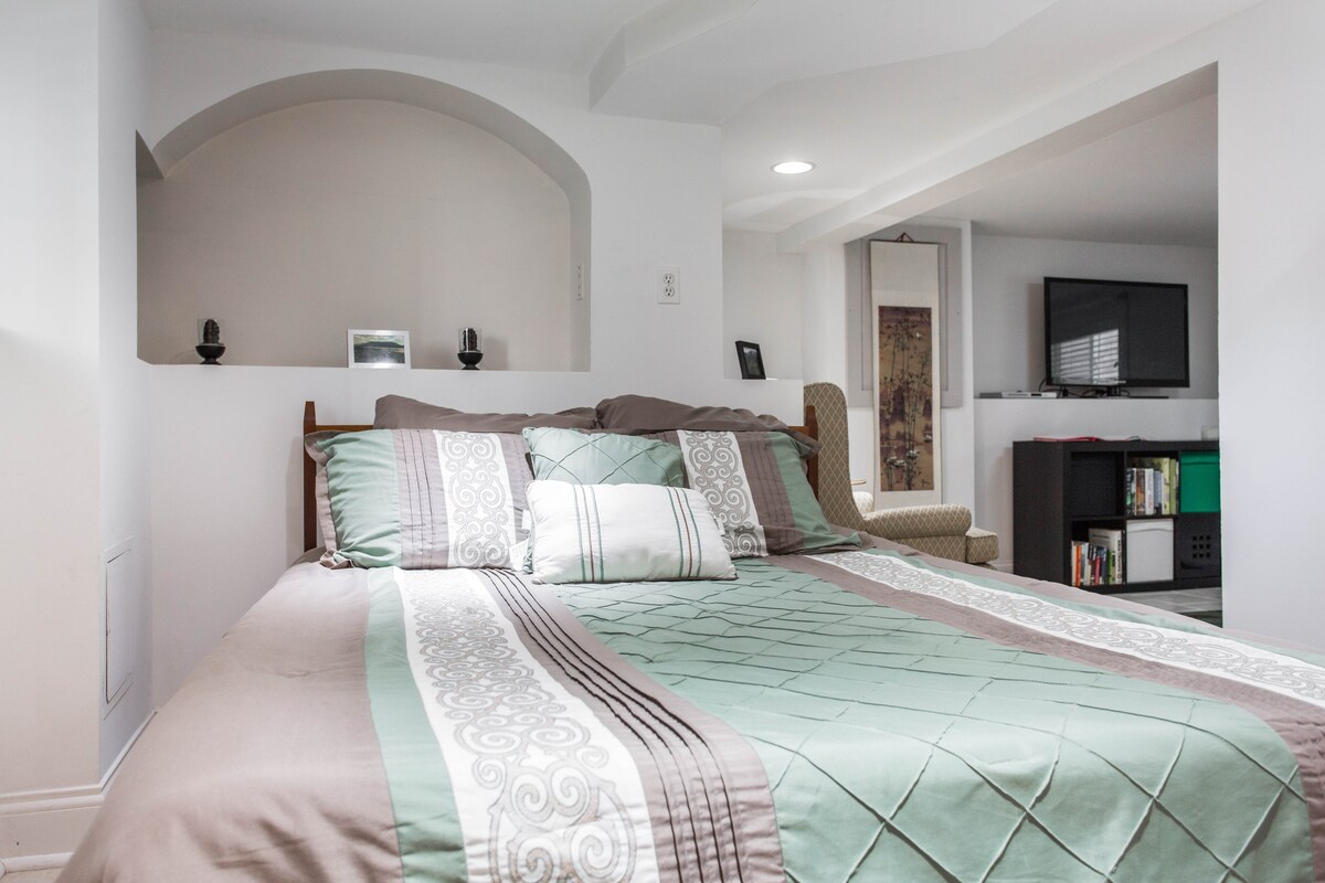 Tempat unik ini memiliki gaya tersendiri. Nikmati studio tamu yang indah dan nyaman ini dengan sentuhan modern dan ruang tamu berperabot lengkap, dapur kecil dengan kulkas mini dan microwave untuk memanaskan kembali makanan cepat sebelum menuju ke kota, kamar mandi lengkap dengan pancuran hujan, dan penyemprot genggam untuk membantu Anda bersantai setelah hari yang panjang. TV layar datar dengan perangkat streaming Xfinity sehingga Anda bisa menghubungkan akun dan menikmati acara dan film favorit Anda untuk menginap dengan tenang.