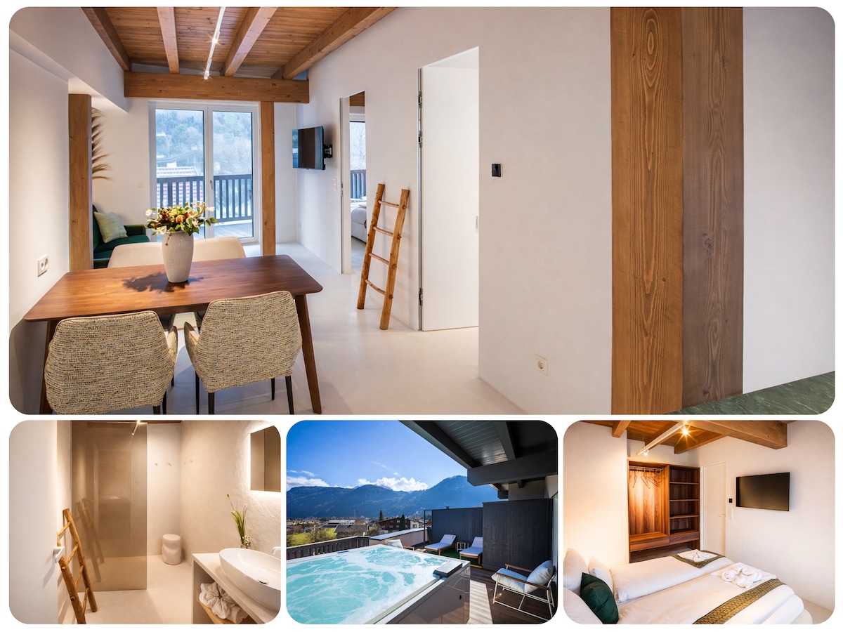 Penthouse N°3 menggabungkan desain modern dengan sentuhan alpine. Nikmati kolam pusaran atap eksklusif yang dikelilingi pemandangan pegunungan yang menakjubkan. Perabotan berkualitas tinggi, kamar yang diterangi cahaya, dan keseimbangan sempurna antara keanggunan bergaya dan kedekatan dengan alam menjadikan penthouse ini unik. Tempat peristirahatan bagi para penikmat – kemewahan bertemu dengan keberlanjutan!