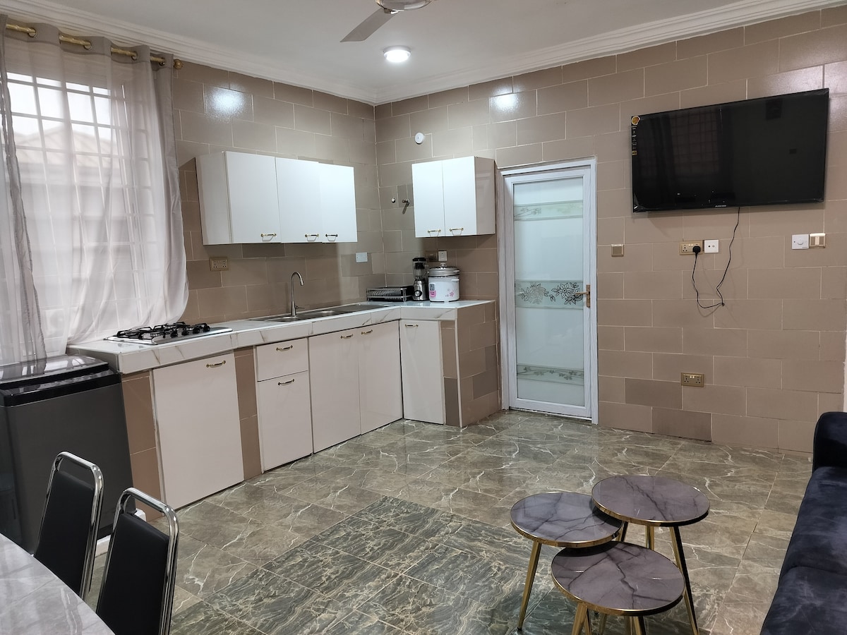 Enjoy a calm and comfortable stay in this cozy one-bedroom apartment with an en-suite bathroom, air-conditioned living room and bedroom, a fully equipped kitchen, private terrace, free parking, TVs in both rooms, and a washing machine. Located in a quiet neighborhood with easy access to shops and transport, the apartment is ideal for solo travellers and couples. A daily prepaid utility allowance of GHS 30 and 6 GB of internet are included. Any extra usage is at the guest’s expense. .