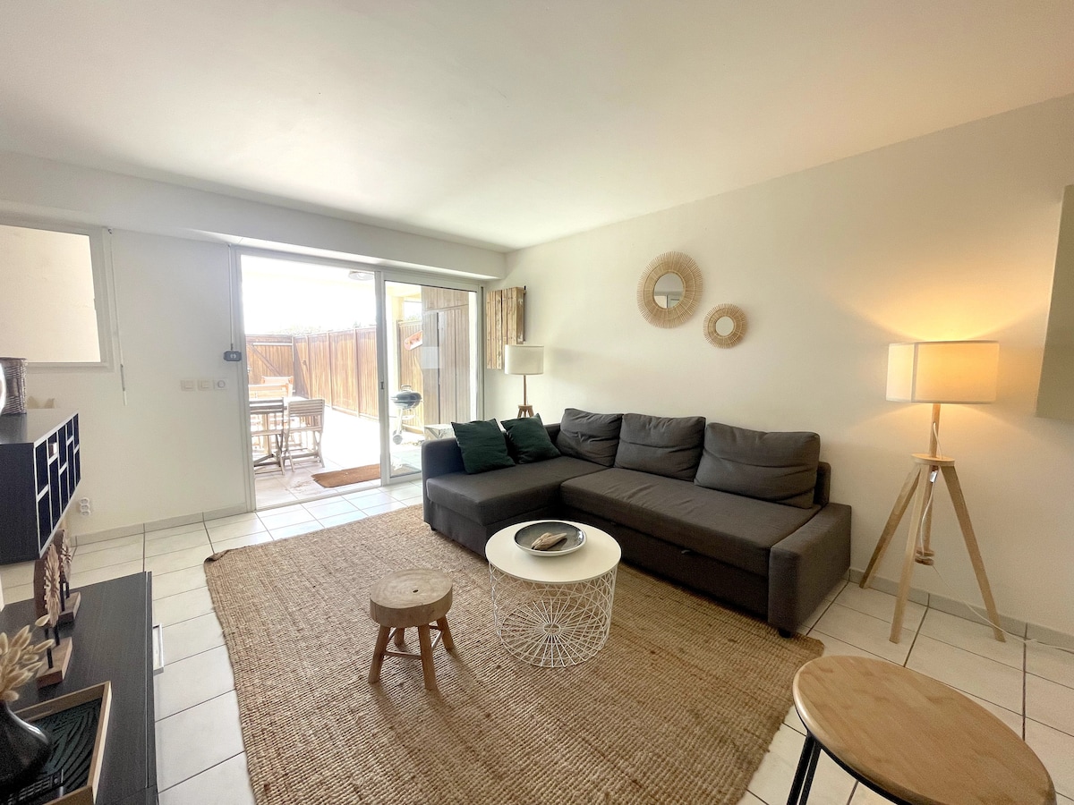 Apartemen seluas 60 m2 ini terletak di tengah - tengah desa Seignosse, yang tenang di cul - de - sac. Semua fasilitas berada di dekatnya (boulangerie, toko kelontong, penata rambut, dll...). Begitu berada di apartemen, Anda akan tergoda oleh kecerahan dan ketenangan tempat tersebut. Ruang tamu menghadap ke kolam pribadi yang warnanya berubah sesuai dengan waktu dalam sehari. Teras terlindung seluas 13 m2 ini akan memungkinkan Anda menikmati suasana indah ini di sekitar makanan, sarapan... atau minuman beralkohol.
