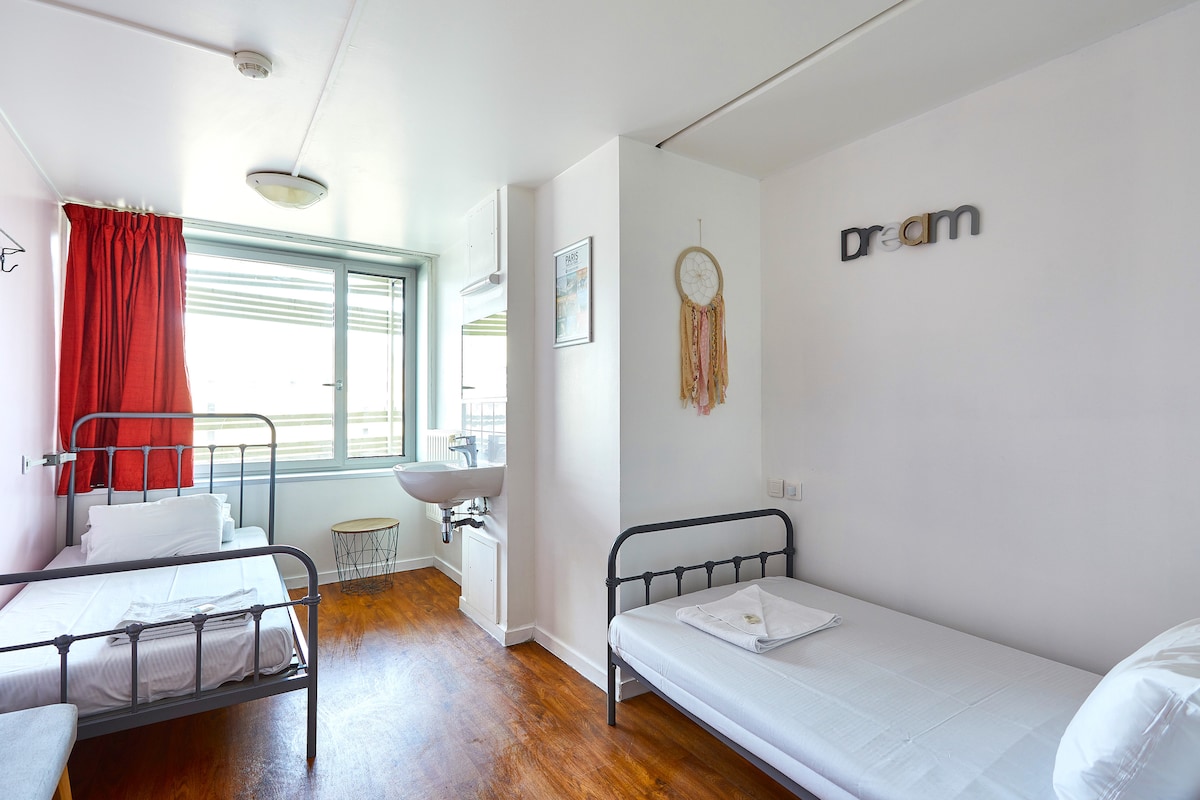 Mari temukan kamar kabin kami! Ruang seluas 5 meter persegi ini memiliki tempat tidur queen size yang sangat nyaman dan merupakan tempat sempurna bagi mereka yang ingin tidur di ruang pribadi total. Setiap kabin mencakup seprai, port USB, lampu samping tempat tidur, tempat untuk menyimpan koper Anda dan mengganti pakaian Anda. Kamar mandi digunakan bersama dan handuk bisa disewakan. Kamar ini memberikan akses ke Happy House, ruang sosial untuk tamu di dalam rumah saja. Anda akan menemukan semua yang Anda butuhkan untuk menyiapkan camilan atau bersantai bersama teman - teman baru Anda