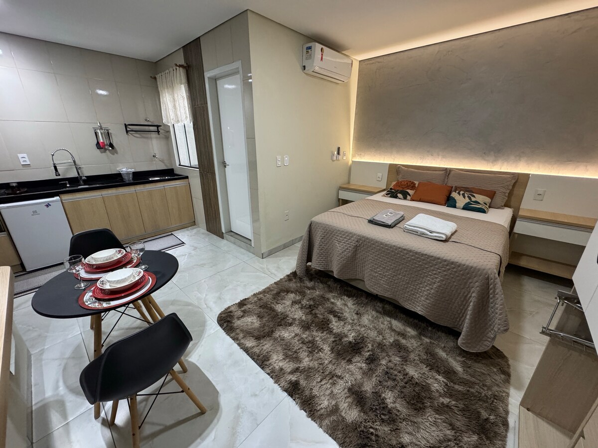 Tempat Nyaman Anda dengan Kenyamanan dan Ketenangan Studio yang nyaman, ideal untuk bekerja atau bersantai. Tempat ini dilengkapi Smart TV, Wi-Fi cepat, minibar, dapur dengan peralatan dasar, tempat tidur yang nyaman, lemari pakaian, dan AC. Terletak di area yang aman dan tenang (lingkungan tinggal kelas atas), tempat ini menawarkan ketenangan dan kenyamanan, dekat dengan toko kelontong, supermarket, apotek, kafe, dan bar. Sangat cocok untuk perjalanan bisnis atau liburan. Pesan sekarang dan nikmati pengalaman unik ini!
