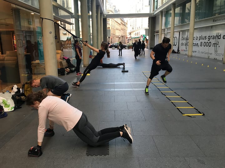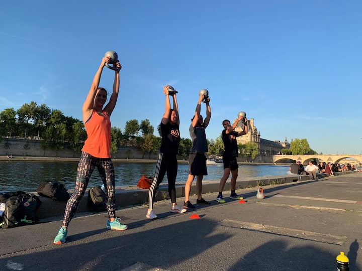 Sesi olahraga untuk 2 hingga 6 orang, menyenangkan dan cocok untuk semua orang. Penguatan, CrossFit®, Hyrox, Fitness... Momen yang menyenangkan dan berbagi untuk bergerak, membakar kalori, dan merasa lebih baik. Di luar di Paris (taman, dermaga Seine) atau di rumah.