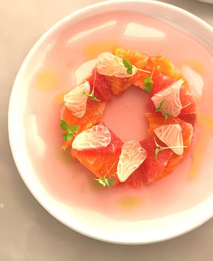 - Crudo ikan raja yang diawetkan, saus melon, sitrus