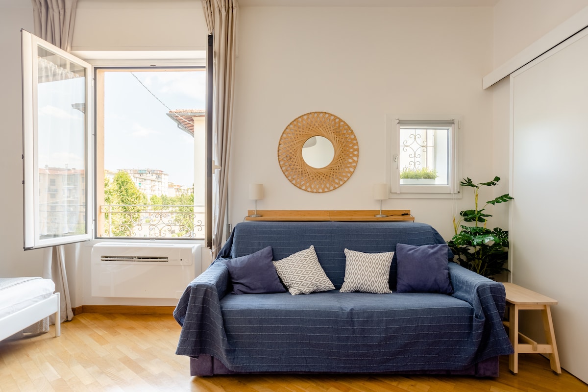 Studio modern yang indah dan nyaman, lantai satu dengan lift, dengan double bed yang sangat nyaman dan sofa yang bisa diubah menjadi double bed, dapur lengkap dan balkon yang luas dengan meja dan kursi untuk bersantai dan bekerja. Mesin Cuci. Wi - Fi cepat. Beberapa menit dari bandara, terhubung dengan baik ke pusat kota dengan bus, trem, dan kereta api 2 menit dari stasiun Florence Rifredi. (Dengan kereta api 5 menit ke pusat kota!) Terhubung dengan bus langsung ke Poliklinik Careggi/Meyer.