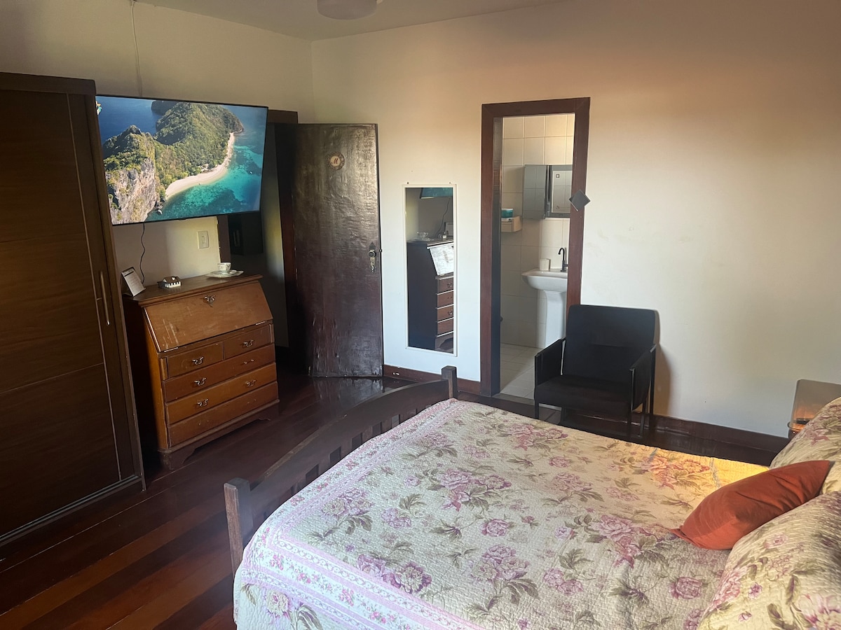 Ambiente familiar, ideal para viajantes da BR 040, ou quem está a trabalho na cidade. A Suíte Nova Iorque, fica à frente da propriedade e conta com cozinha integrada, frigobar, fogão de indução e itens básicos de cozinha. Tem chuveiro quentinho e boa pressão de água. Conta com ar condicionado, Smart TV e wifi. Este quarto tem 1 cama de casal bem confortável com colchão de molas ensacadas. PROIBIDO FUMAR NA SUITE. NÃO É PERMITIDO ANIMAIS DE ESTIMAÇÃO.