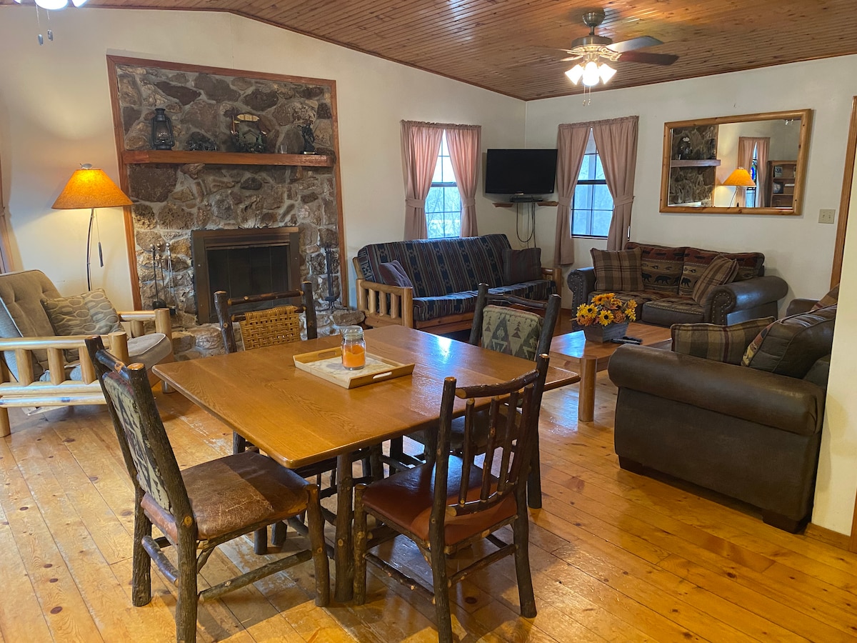 Kabin Ranch House (2020)di Old Desperado Ranch memiliki tema koboi barat pedesaan. Perapian batu (listrik) dibuat dengan batu - batu lokal dari anak sungai dan sungai. Kabin dua kamar tidur sangat luas dan dilengkapi dengan segala yang Anda butuhkan untuk masa inap Anda. Hanya bawa makanan Anda! Kabinnya ramah anjing, lihat kebijakan hewan peliharaan. Windy's Will menjemput Anda untuk mengapung dari kabin Anda. Pastikan untuk memeriksa kabin kami yang lain - rumah susun, rumah kecil. Trailrides tersedia berdasarkan reservasi.