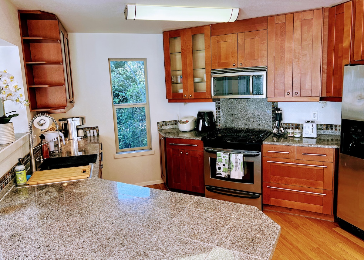 Pemandangan ★ Gunung & Pemandangan Laut Sebagian ★ Baru direnovasi dan dilengkapi dengan gaya modern ★ 4 dek dilengkapi dengan hammock, kursi telur gantung dan area duduk ★ 2 kamar tidur besar, 3 tempat tidur (2 queen, 1 king) untuk menampung semua anggota keluarga Anda ★ 3 menit berjalan kaki ke Nature Trail, 20 menit berjalan kaki ke pantai Internet ★ berkecepatan tinggi, Smart TV dengan aplikasi streaming ★ Dapur yang luas untuk menyiapkan makanan keluarga & teman-teman Anda Meja berdiri yang dapat disesuaikan secara★ elektrik untuk Anda bekerja dari jarak jauh dengan nyaman ★ Perapian dalam rumah