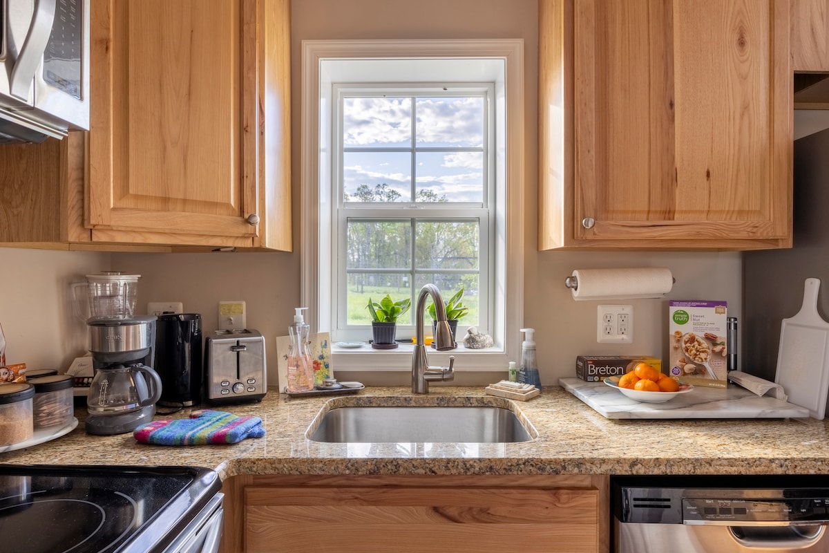 Hay Loft terletak di tengah - tengah 43 hektar yang indah, menghadap peternakan jerami kerja kami dengan pemandangan Pegunungan Shenandoah yang menakjubkan. Kami berada di dekat restoran, kebun anggur, barang antik, medan perang, resor golf, resor ski, dan gua. Suite pedesaan/luxe yang luas dengan perapian gas; tempat tidur king dan kamar mandi dengan pancuran ubin, pembuat kopi Keurig, microwave, oven pemanggang roti, kulkas kecil, tanpa freezer, piring dan pemanggang gas luar ruangan dan perapian gas dalam ruangan. Perapian luar ruangan.
