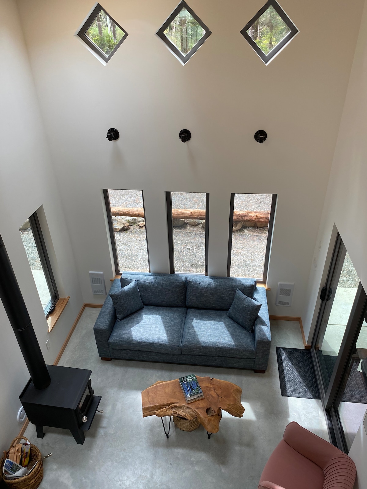 Nestled among the towering trees of Jordan River, BC, Woodshed offers a serene retreat. Clean lines, natural wood finishes, and minimalist design blend with the lush coastal forest. Expansive windows invite dappled light and frame uninterrupted views of evergreens, creating tranquility and connection to the outdoors. Designed to evoke calmness, the space balances warmth and simplicity, where the whisper of trees and distant ocean sounds set the perfect backdrop for rest and reflection.