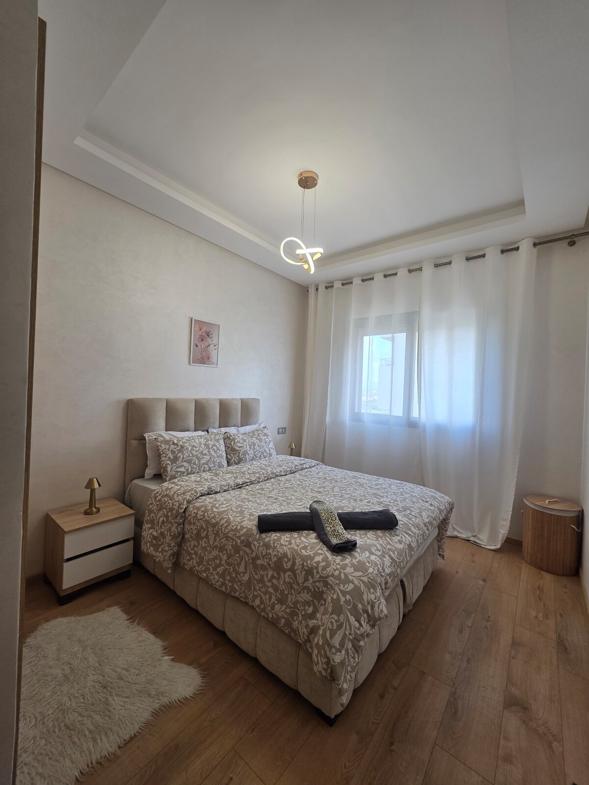 Ilova company is proud to offer this bright and fully equipped appartement on first floor of a quiet &secure neighborhood Mohammedia central. 5 mins drive to serene beaches & steps away from supermarkets, cafés, restaurants, train station, with easy access to major highways. Enjoy a modern living room with traditional Moroccan touch, fully equipped kitchen, balcony, 100 Mbps fiber-optic Wi-Fi, and adedicated workspace, perfect for remote workers. Free and secured parking is available. Book Now