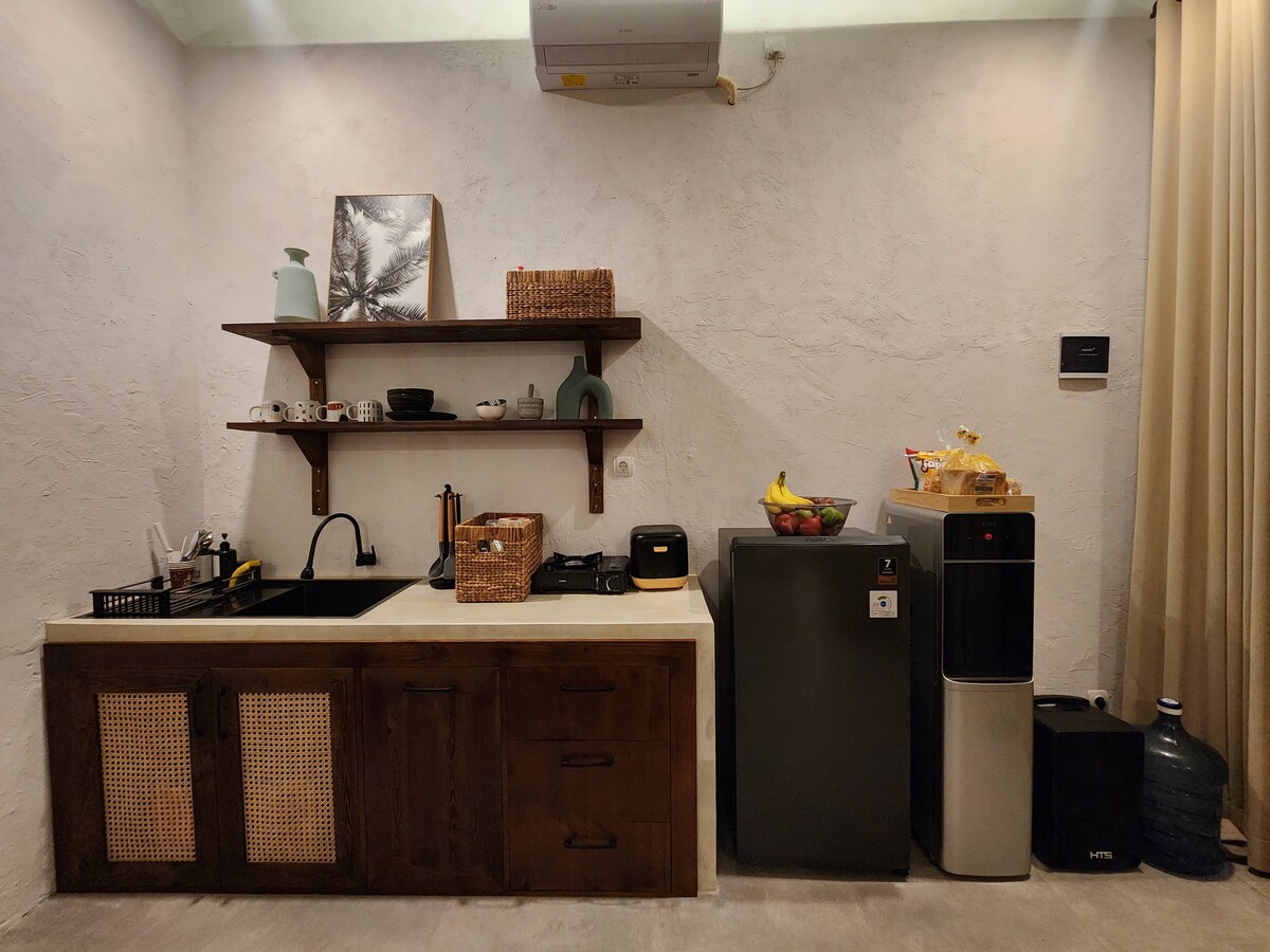 Rasakan pengalaman menginap yang tenang, privat, dan nyaman Dikelilingi oleh suasana alam yang hijau dan udara yang segar, villa ini menjadi pilihan sempurna untuk staycation, honeymoon, liburan santai, atau quality time bersama keluarga kecil. ⸻ Fasilitas Villa • Extra King Size Bed (200x200) • Smart TV (Netflix Ready) • WiFi Gratis • Water Dispenser • Kulkas • Water Heater • Bathtub • Perlengkapan mandi • Meja makan • Mini pantry untuk memasak ringan • Peralatan makan • Hair dryer