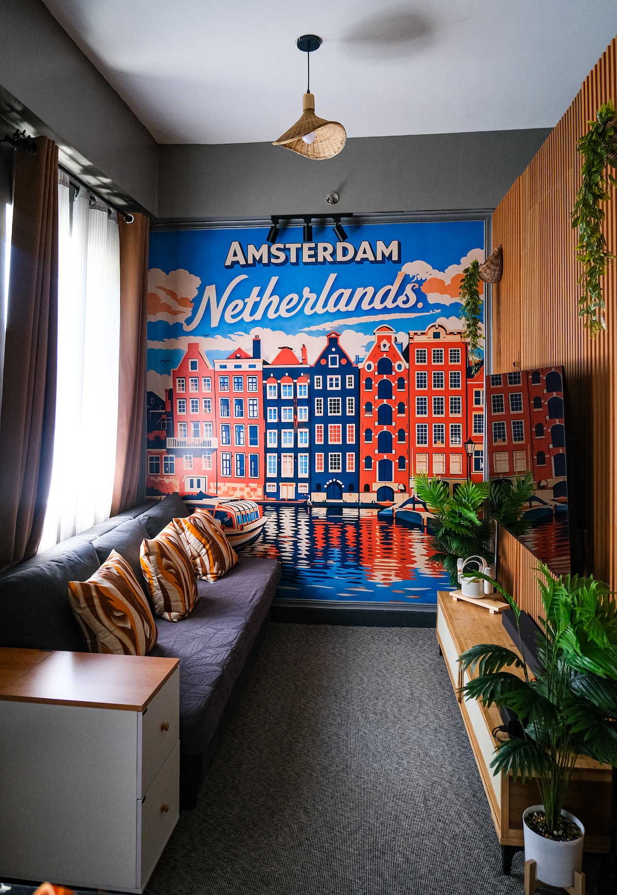 Selamat datang di kondominium kami yang unik dan nyaman dan berperabot lengkap! Kondominium ini terletak hanya 5 -6 menit dari Nuvali, 20 menit dari Enchanted Kingdom, dan 30 menit dari Tagaytay. Tempat ini memiliki dapur lengkap, WiFi gratis, dan home theater yang akan membuat Anda merasa seperti berada di barisan depan bioskop. Kami dekat dengan mal, taman hiburan, dan restoran. Untuk kemudahan Anda, kami telah memasang smart lock di pintu depan, sehingga memudahkan proses check - in mandiri.