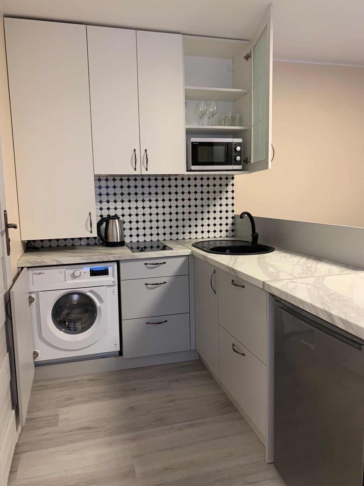 Flat 1 kamar tidur yang hangat dan berwarna - warni untuk hingga 4 tamu. • Seprai dan handuk segar disediakan sebelum setiap masa inap. • Pembersihan mingguan dan seprai baru, handuk jika Anda menginap lebih dari satu minggu. • Sabun, shampoo, teh, kopi disediakan. • Smart TV 4K 55'' • Broadband Wi - fi super cepat. • Dapur dilengkapi dengan microwave berkualitas, ketel juga peralatan lain yang diperlukan termasuk setrika, meja setrika, mesin cuci, kulkas - freezer. Tersedia panci, wajan, dan peralatan yang diperlukan lebih lanjut untuk perlengkapan dasar memasak.