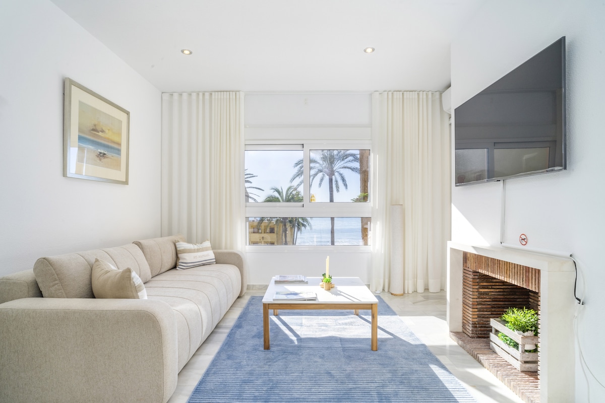 Cozy, bright, entirely renovated quality flat on the front line with sea views from the sunny and large balcony, both rooms and the bathroom. Features his and her shower, full kitchen, 2 tennis courts, 2 swimming pools (1 for children) large gardens, private beach area, free beach beds and private parking. We have a sandy beach with Blue Flag status and direct access to the sea boardwalk. Near Marbella and La Cala with 75+ restaurants and many shops walking distance. Strict cleaning in protocols