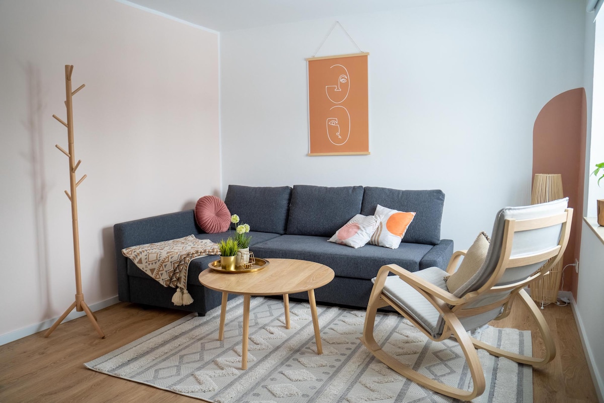 Apartemen modern kami memiliki luas 68m² dan dirancang untuk 1 -5 orang. Apartemen ini memiliki: 2 kamar ganda dengan box spring bed 1 ruang tamu & ruang makan dengan sofa bed 1 dapur dengan mesin cuci piring, oven, kompor, kulkas, freezer, microwave... 1 kamar mandi 1 koridor 1 teras besar 2 tempat parkir 1 Brankas Wifi. Fasilitas untuk anak - anak: 2 boks bayi portabel 2 Kursi tinggi 1 meja ganti popok dengan Windeltonne 1 kamar mandi bayi 1 kisi - kisi perincian 1 dudukan toilet 1 monitor bayi 1 selimut merangkak Mainan...