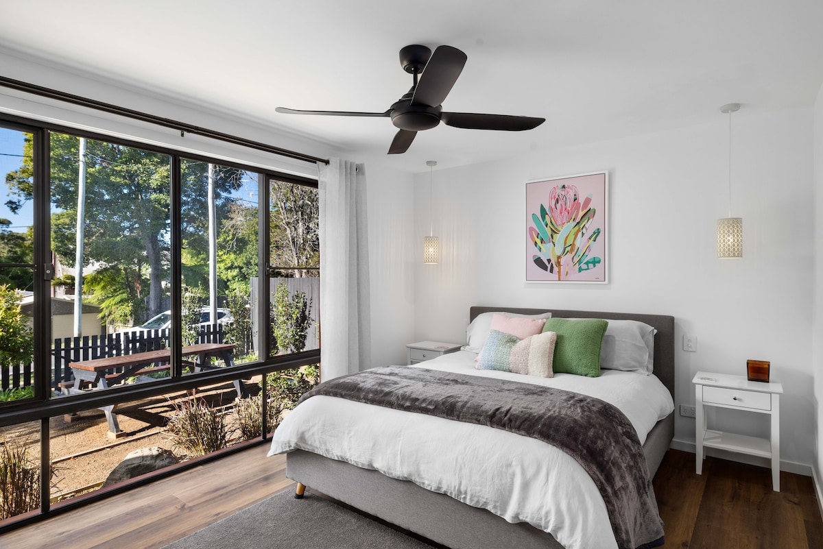 Tersembunyi di balik pagar kayu pedesaan dan taman tropis, bungalo yang dipenuhi karakter ini merupakan perpaduan menakjubkan antara pesona masa lalu yang dipadukan dengan kenyamanan modern. Pondok bermandikan sinar matahari yang indah, penuh dengan jiwa Byron Bay. Berjalan kaki mudah ke kafe Roadhouse yang populer dan Peaches Pilates dan hanya beberapa menit dari jalur berpasir ke pantai, Pink Moon Bungalow sangat cocok bagi mereka yang ingin melarikan diri dan bersantai, sementara hanya beberapa menit dari pusat Byron Bay.