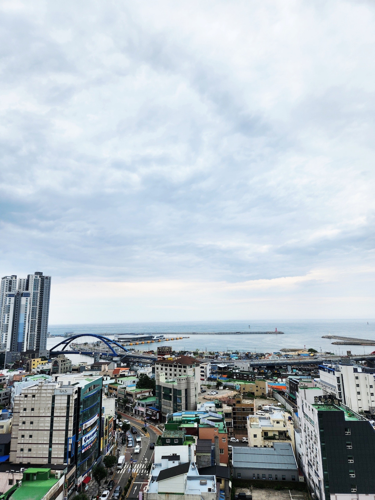 Matahari terbit dari kamar di lantai 25. Pemandangan laut. Pemandangan matahari terbit. Pemandangan gedung tinggi.Kolam renang infinity. Pantai Sokcho, jalan keliling Oeongchi. Netflix